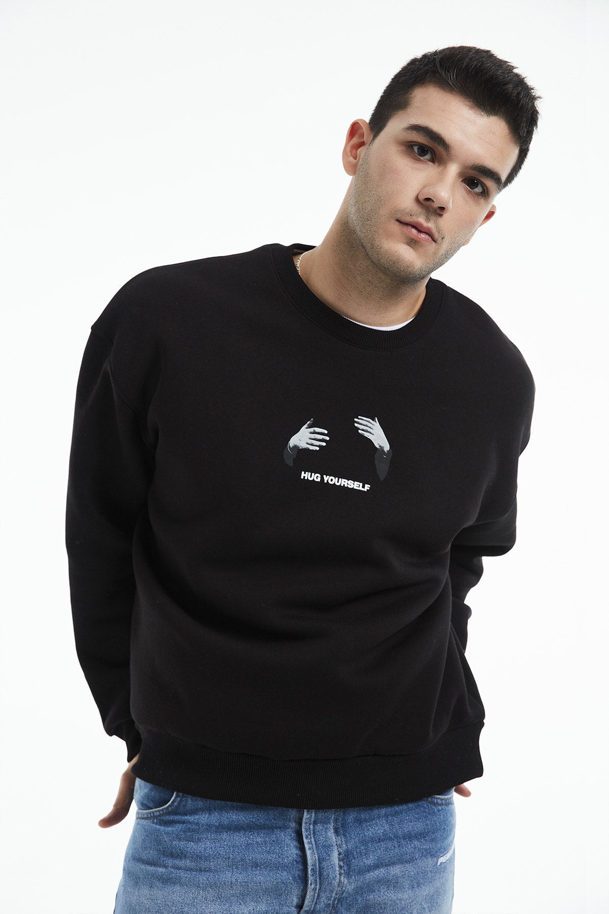 Eazy Co Eazy Hug Yourself Oversize Unisex Siyah Bisiklet Yaka Kalın Sweatshirt