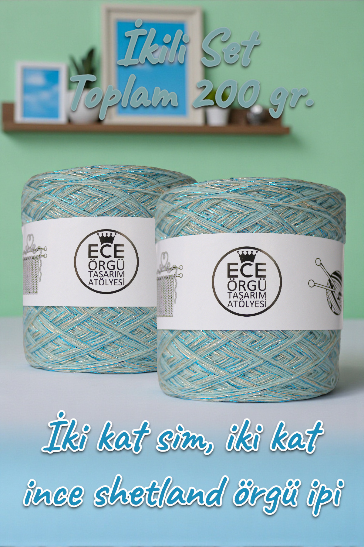Ece Örgü Tasarım Atölyesi 2 kat açık mavi shetland ile 1 kat mavi ve 1 kat ten rengi gümüş viskon sim karışımı örgü ipi Özellikleri