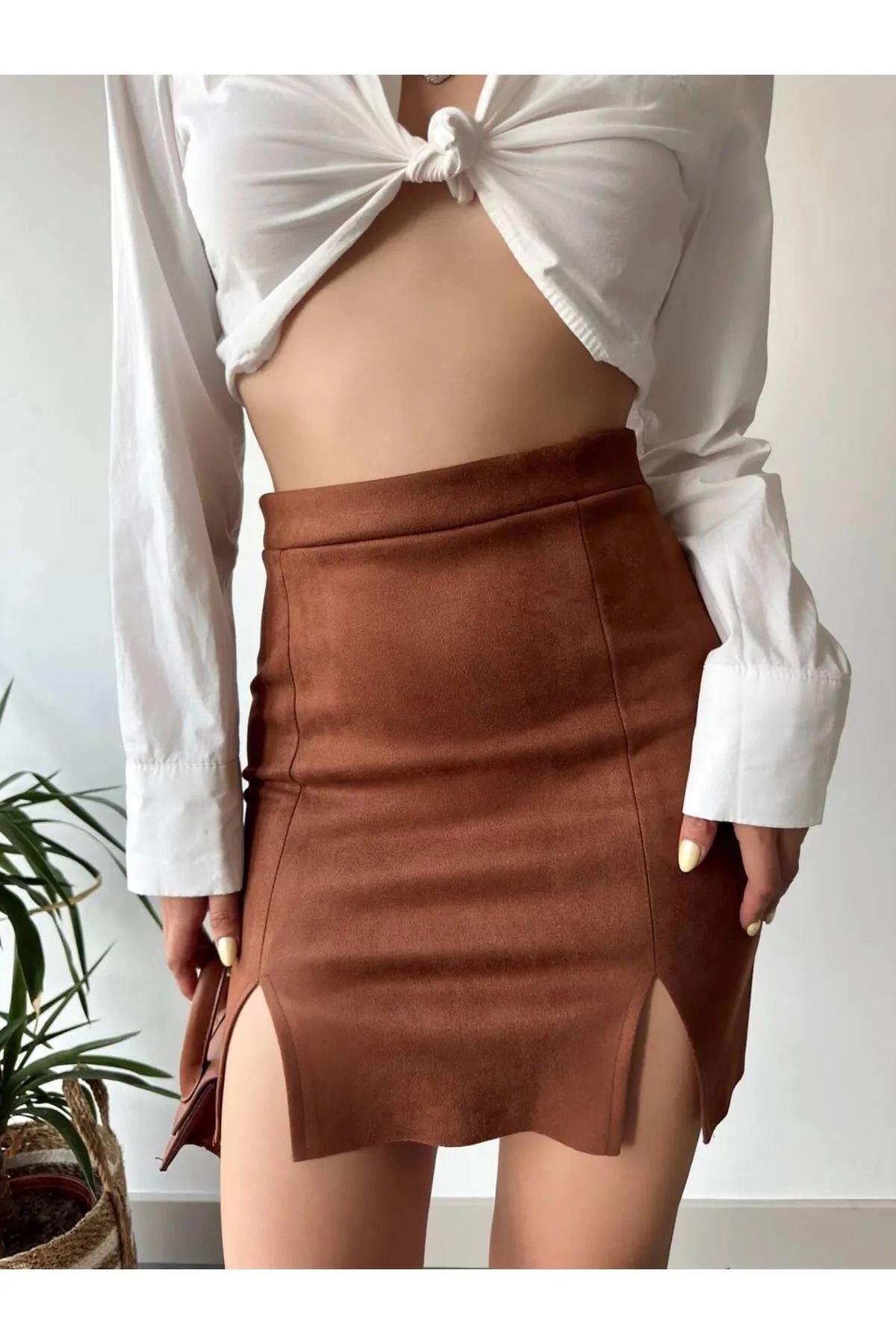 Ecenin Favorileri Taba Süet Etek - Çift Yırtmaçlı