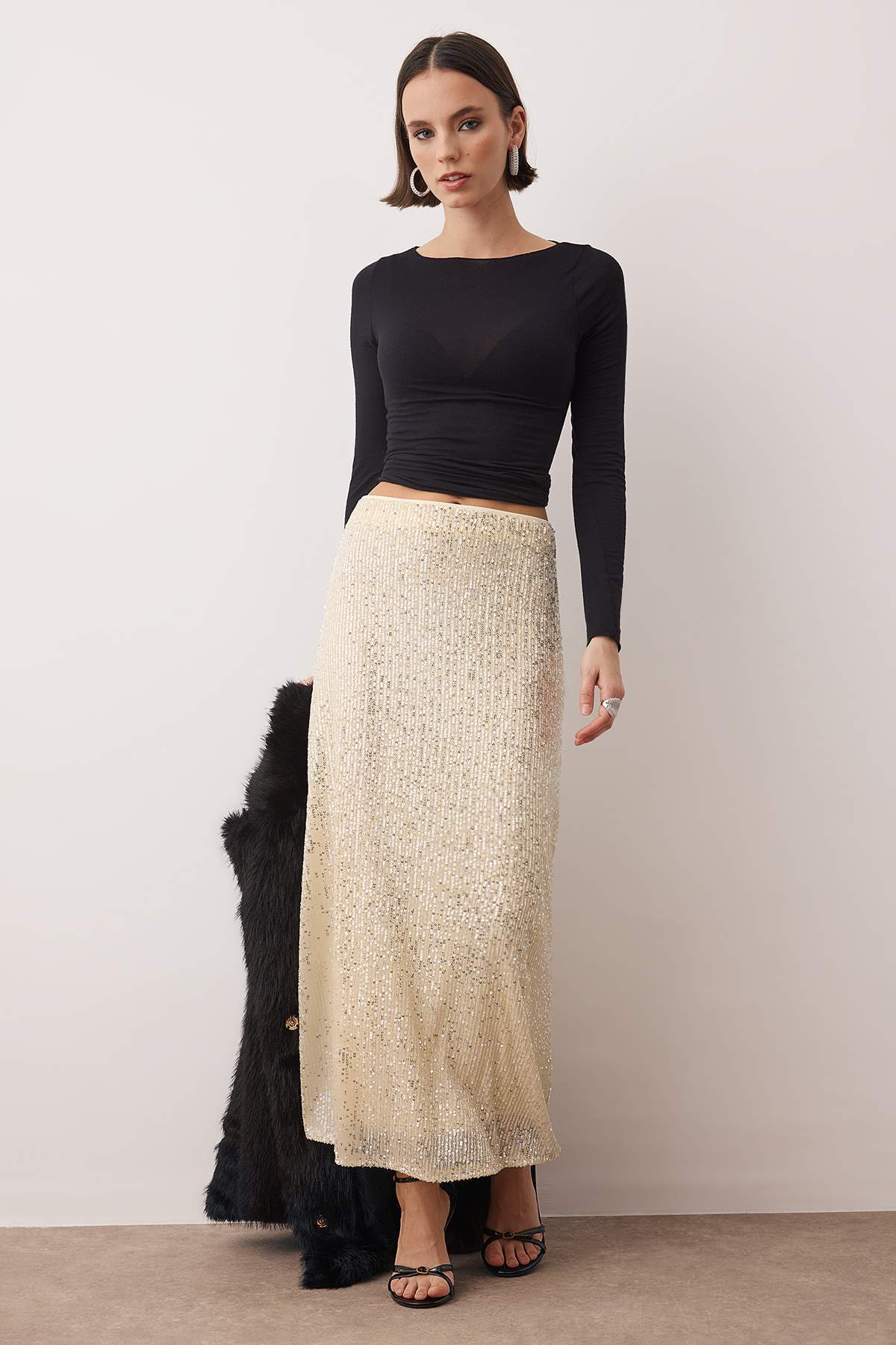 Trendyol Collection Ασημένια φούστα με παγιέτες Midi Party TPRAW26ET00014
