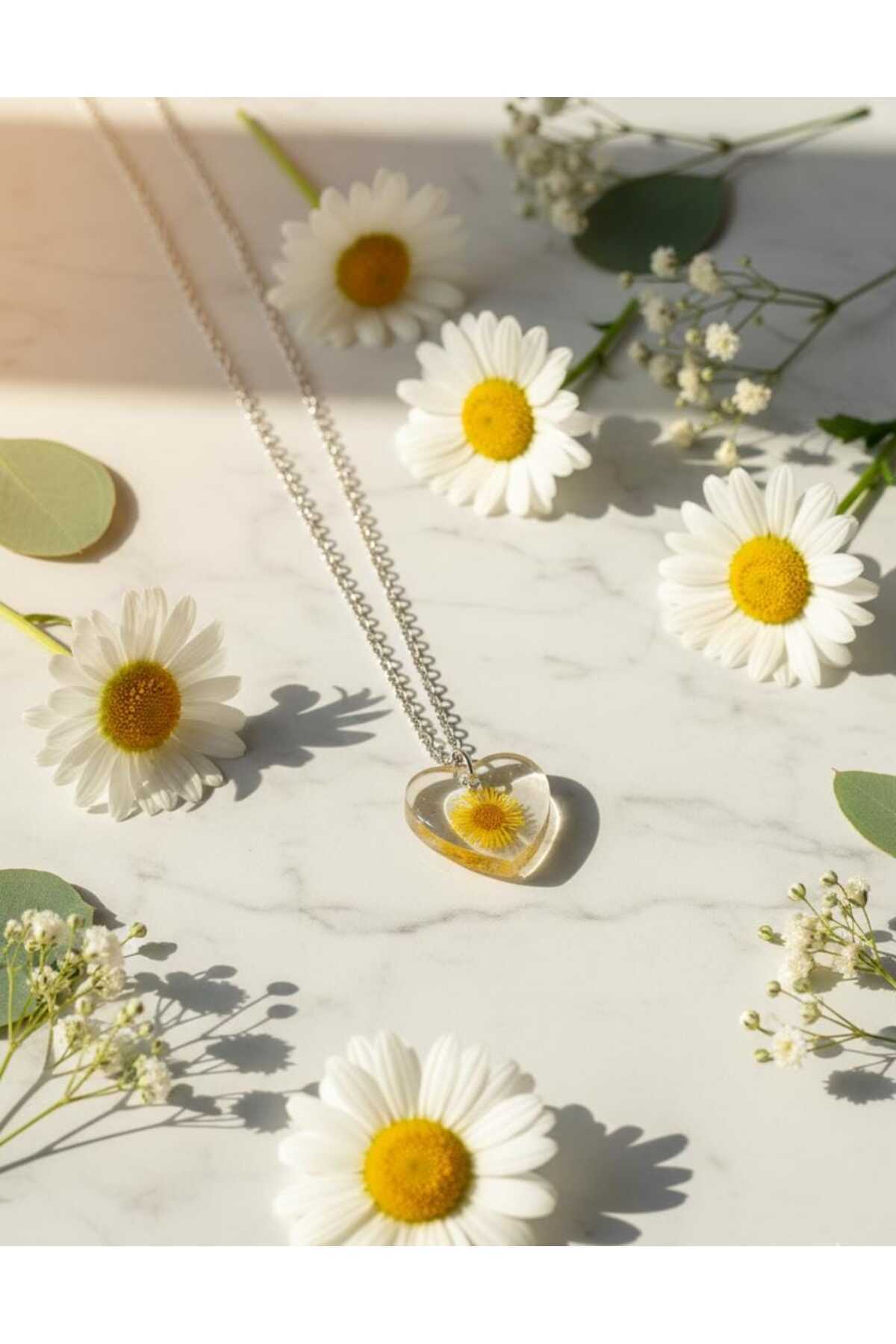 Elzem Özel Epoksi kurutulmuş sarı çiçek kalpli kolye Özellikleri