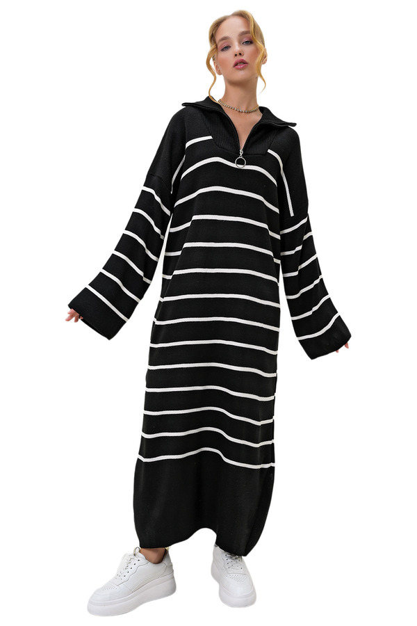 Happiness İstanbul Women's Black Striped Long Oversize Knitwear Sweater YY00078