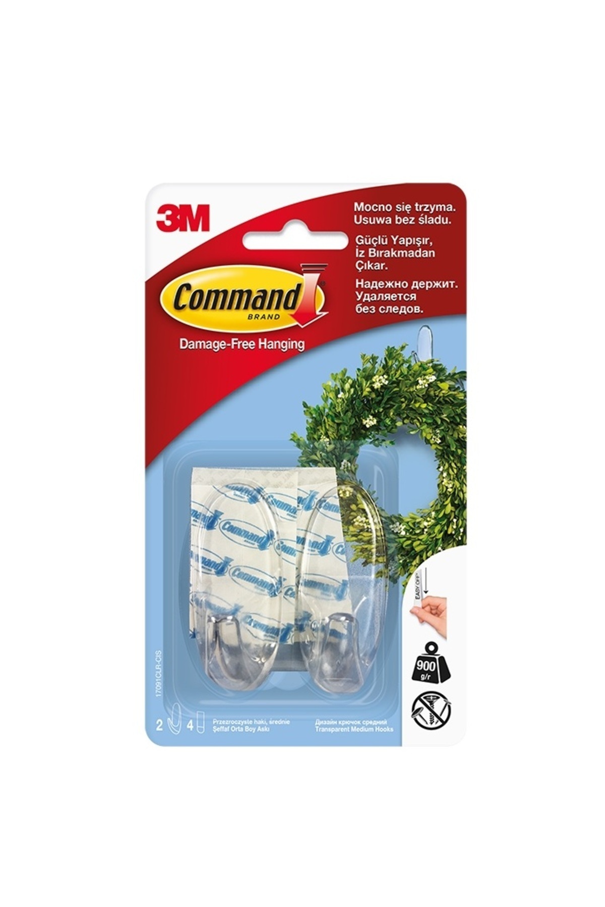 3M Medium transparent hook 2 hooks + 4 double-sided adhesive tapes/set Command features