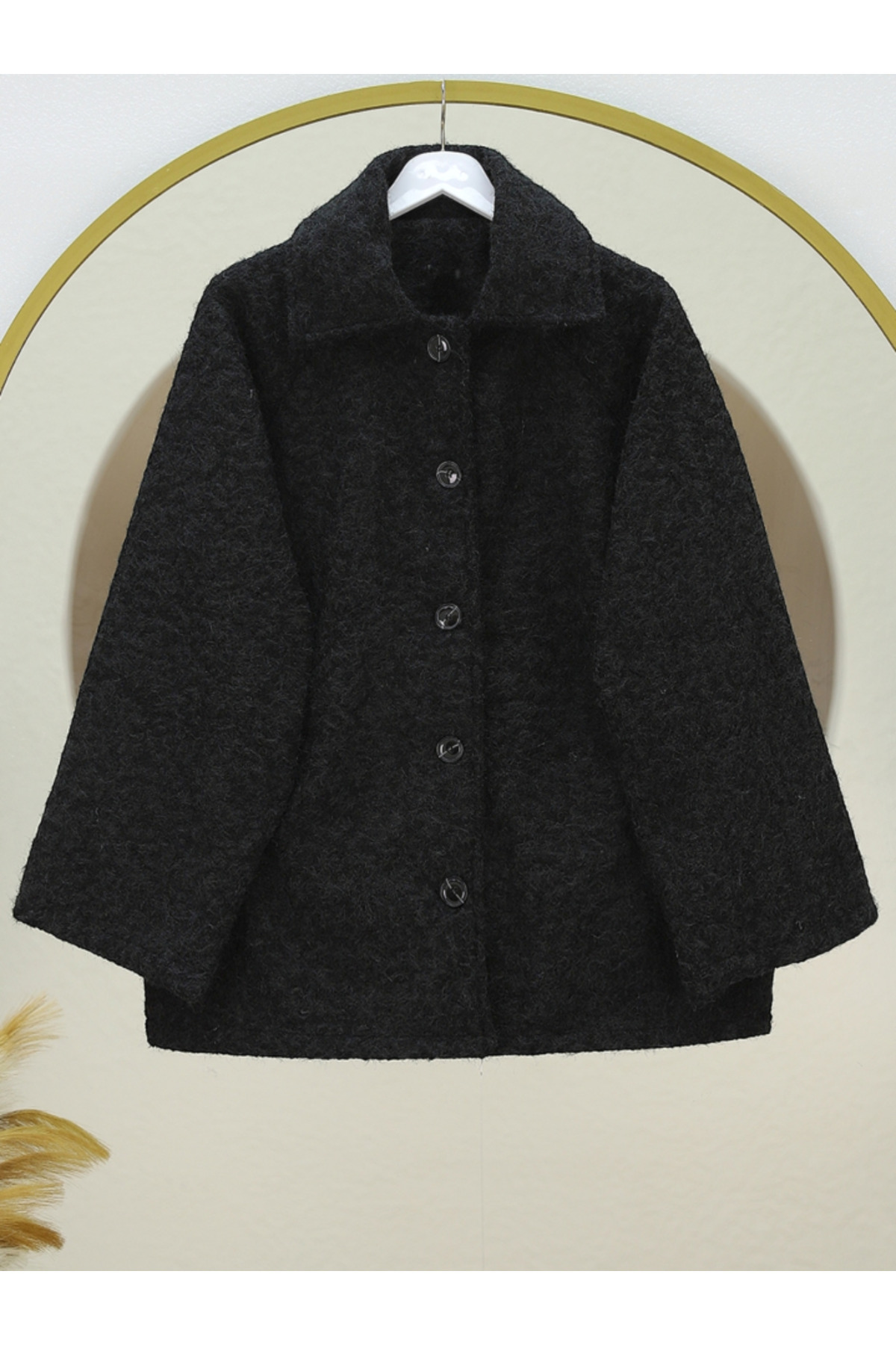 BEFAON Double pocketed, buttoned front lined boucle coat - black features