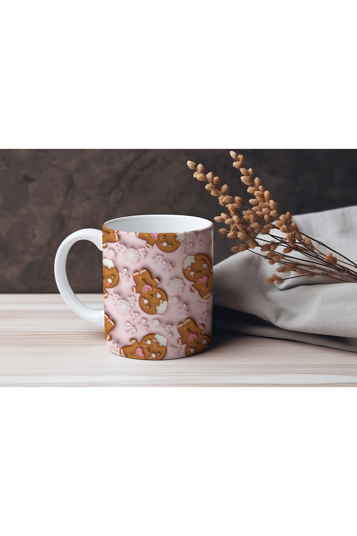 Beramussa 3D Effect Gingerbread Design Mug – Pink Snowflake Pattern – Non-Embossed