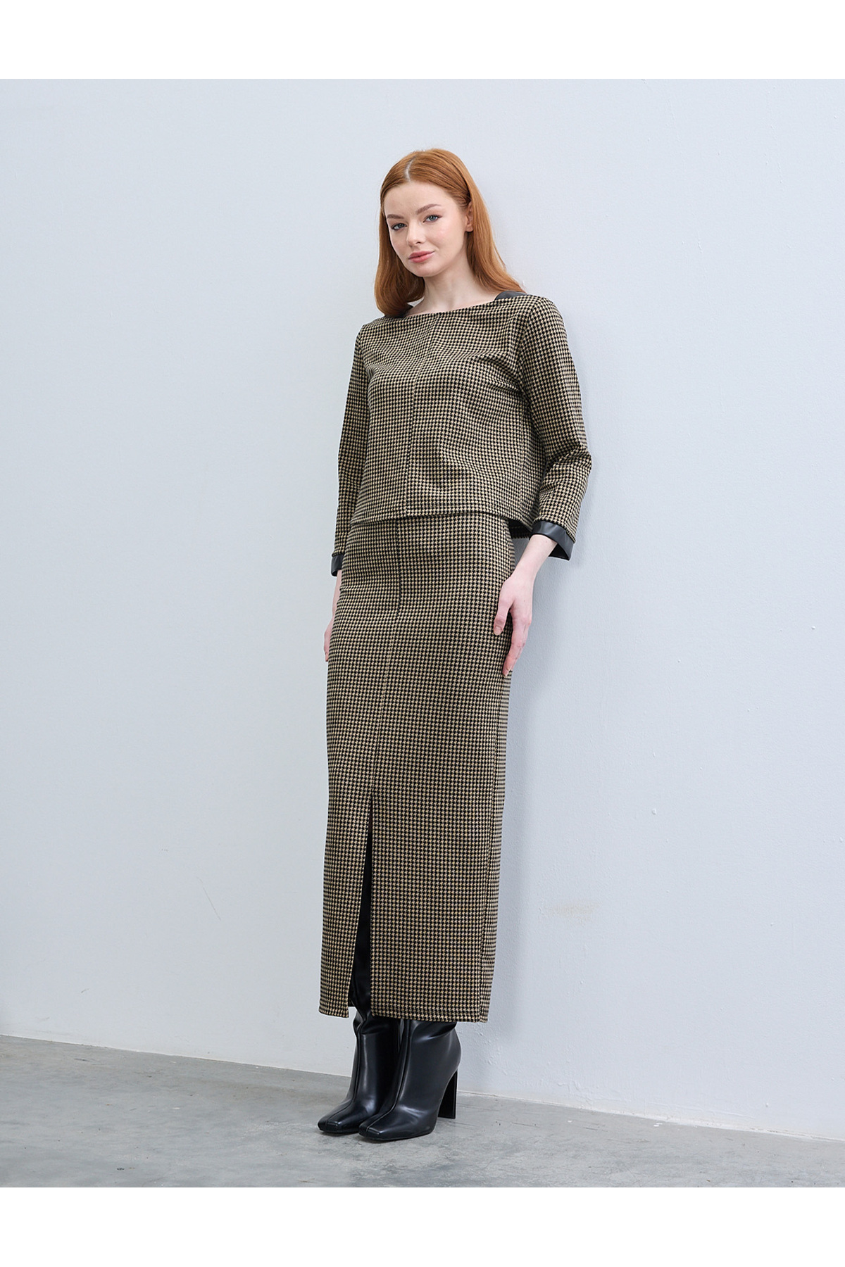 BGN workshop Kazayagi Patterned Leather Paneled Split Midi Skirt features