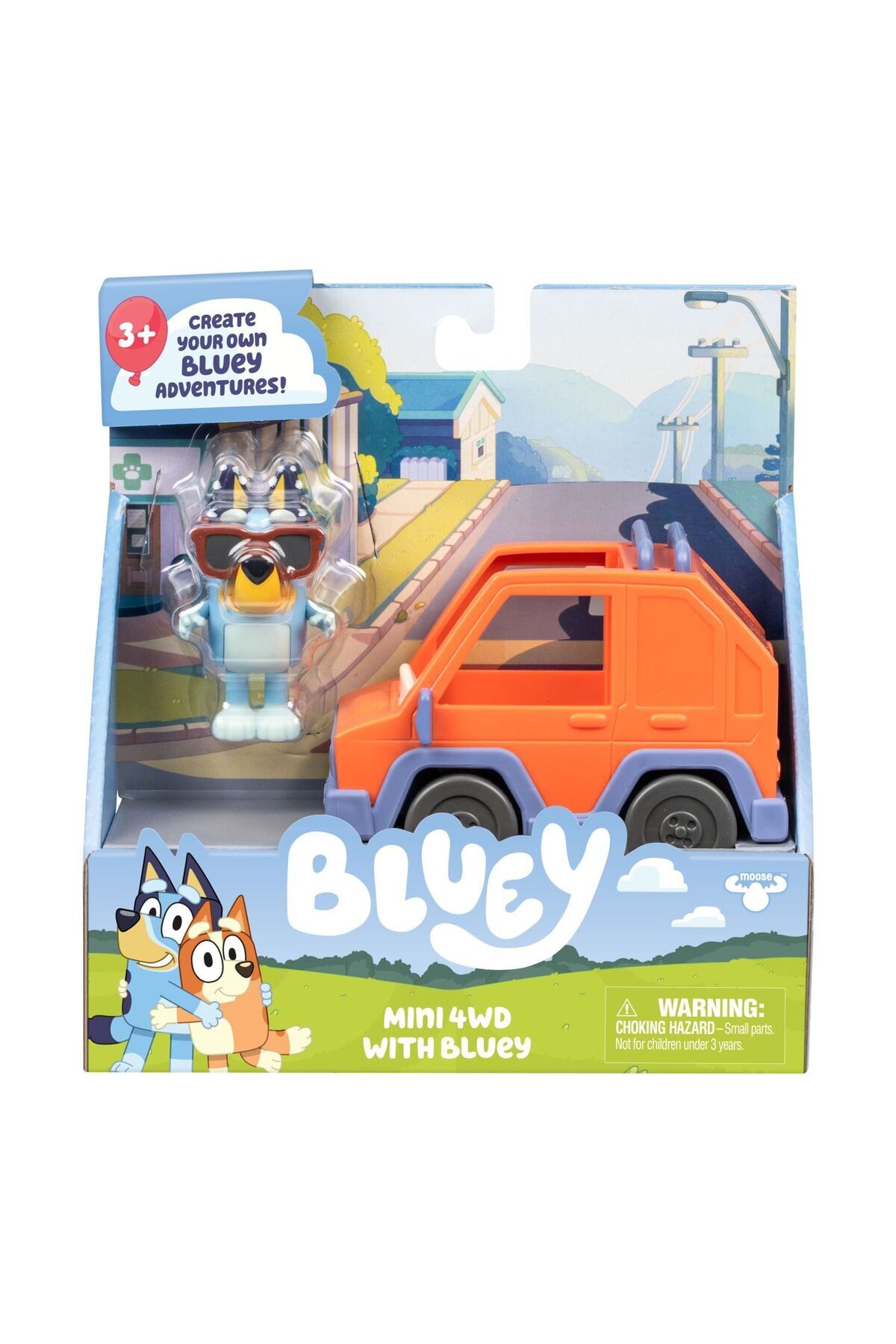 Includes a 3" (7.6 cm) Bluey figure with flip-up sunglasses and articulated arms and legs for play and posing. Fits one 2.5–3" (6–7.6 cm) figure inside.