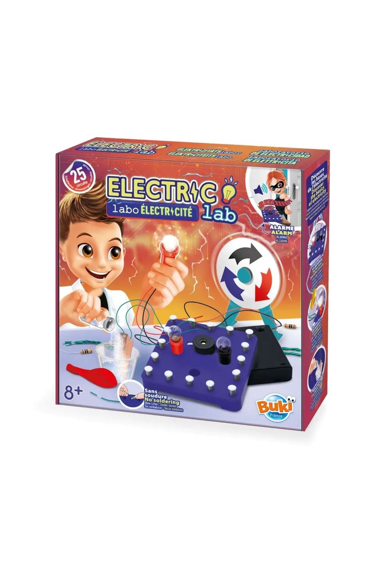 motor, buzzer, 2 bulbs, flashing bulb, 2 resistors, secure battery compartment and 1 illustrated instructions