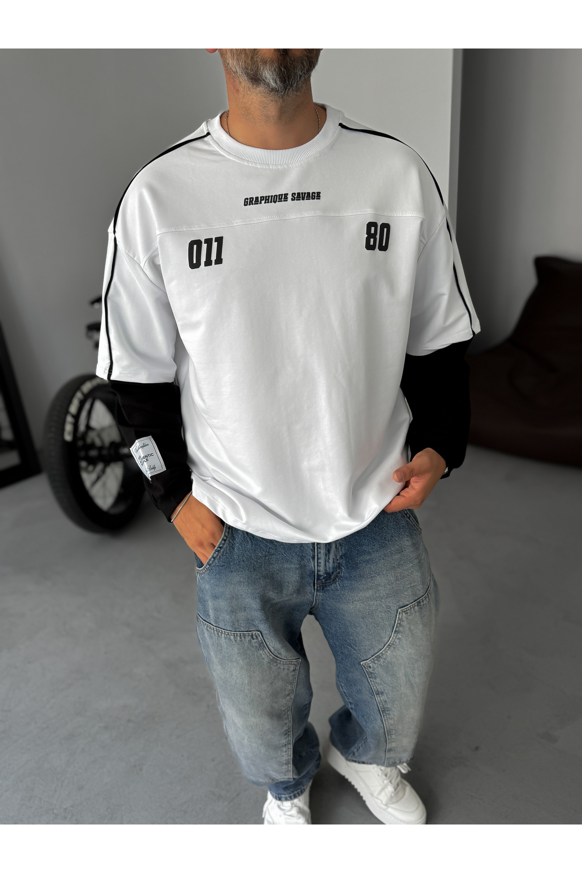 BYBASICMAN Beyaz Graphique Embossed Patchwork Sweatshirt Jj-106 features