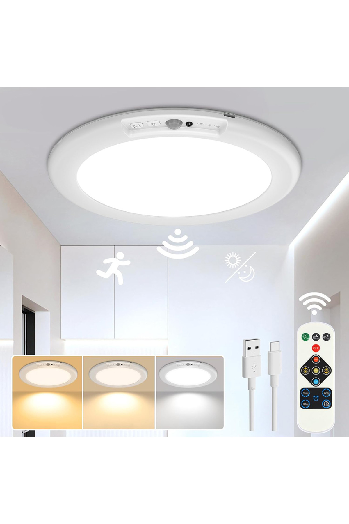 Choice WHITE PIR Motion Sensor Wireless LED Ceiling Lights Dimmable with Remote Control Timer Rechargeable features