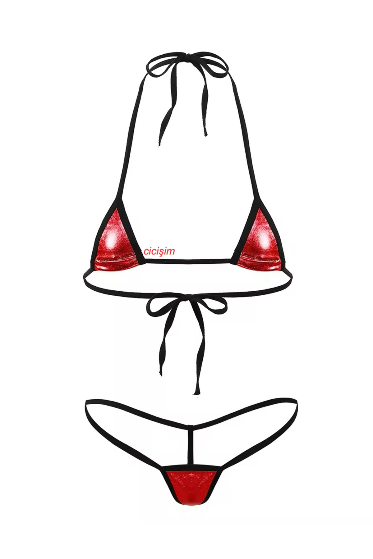 Cicişim Black Drawstring Red Leather Look Drawstring Bikini Set features