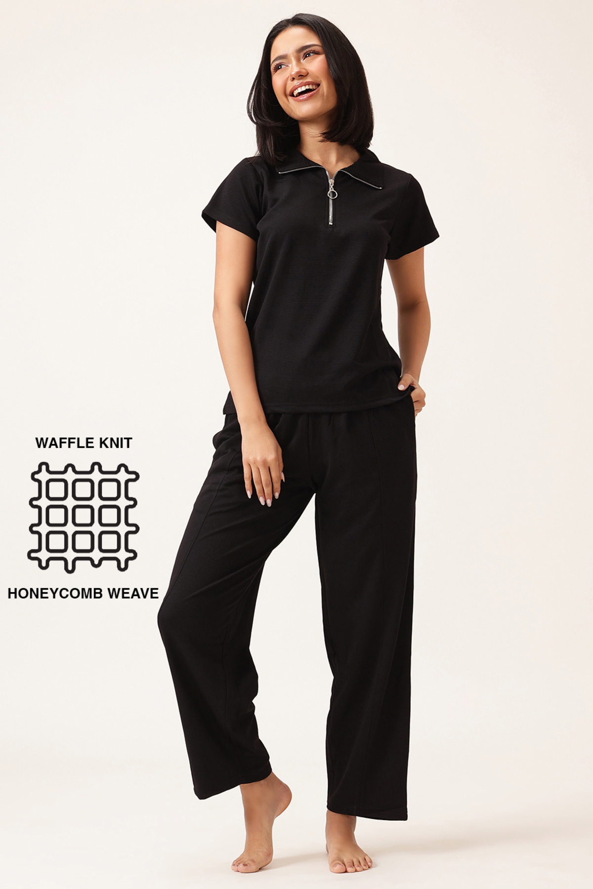 Clovia Chic Basic T-shirt & Pyjama Set in Black - Waffle features