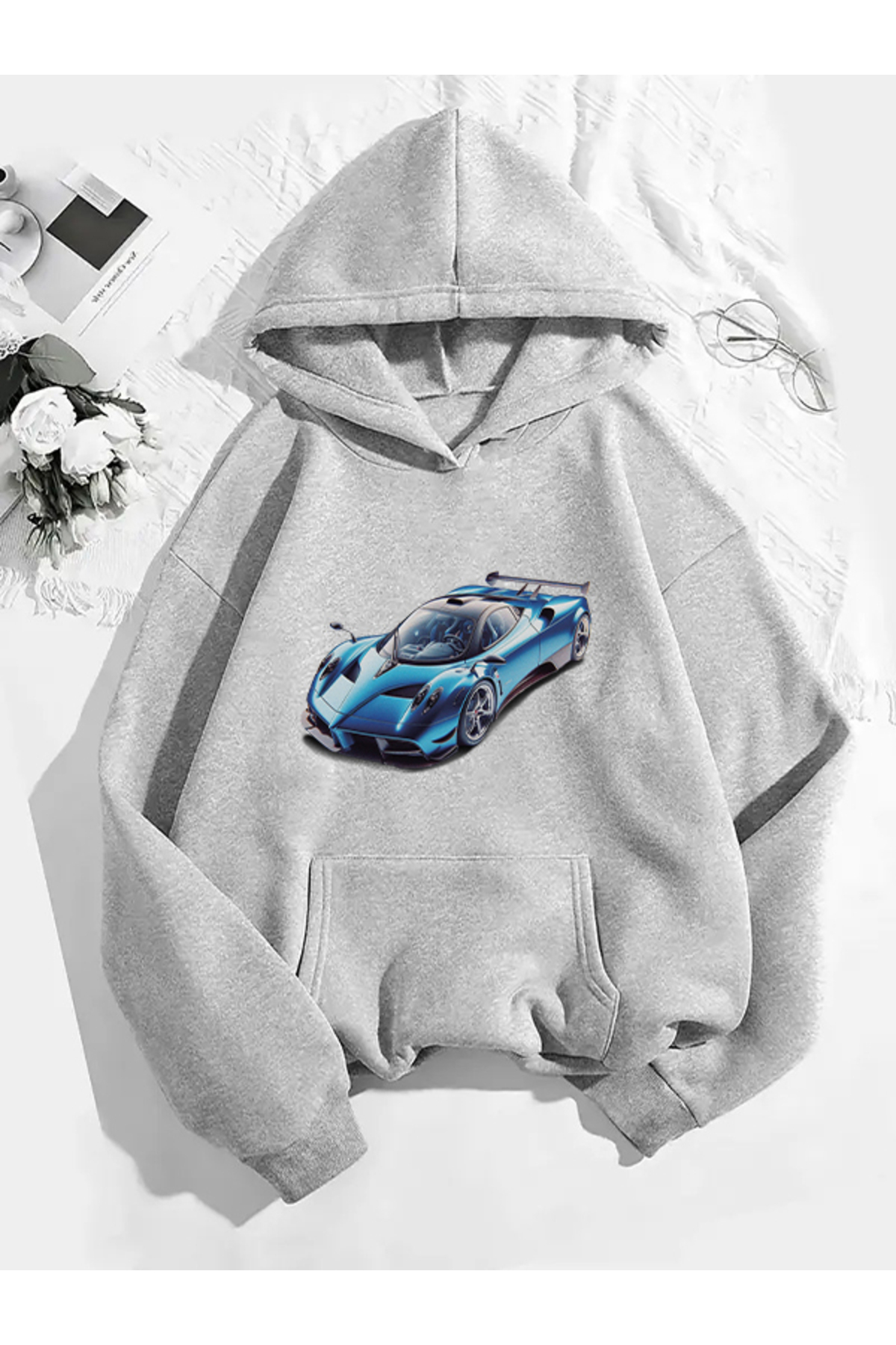 COMVİCHO Blue Printed Hooded Gray Sweatshirt features