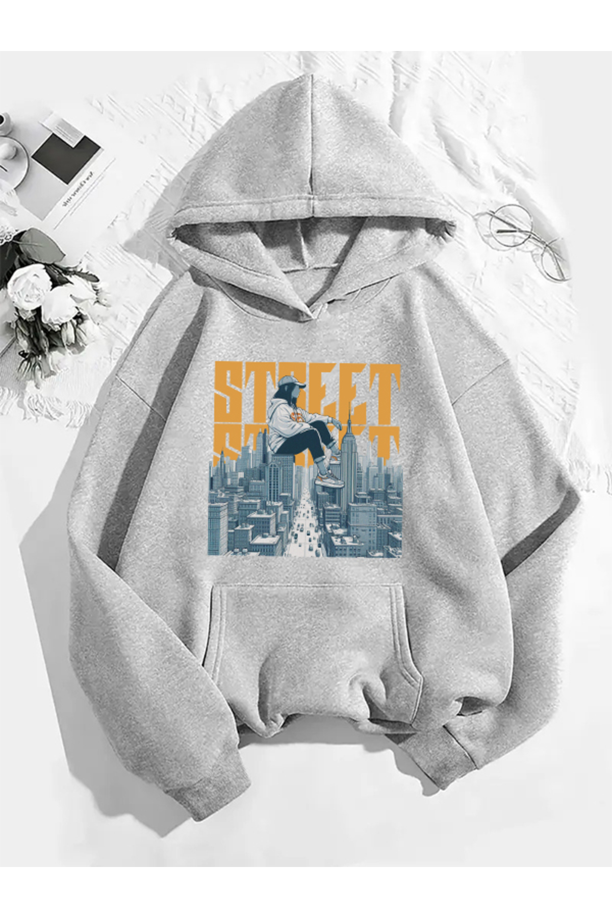 COMVİCHO Street Printed Hooded Gray Sweatshirt