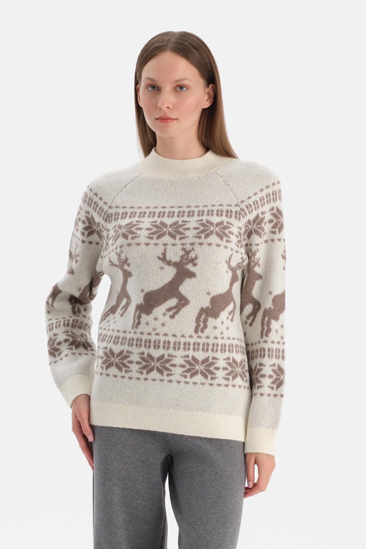 Dagi Ecru Deer Patterned Christmas Sweater features