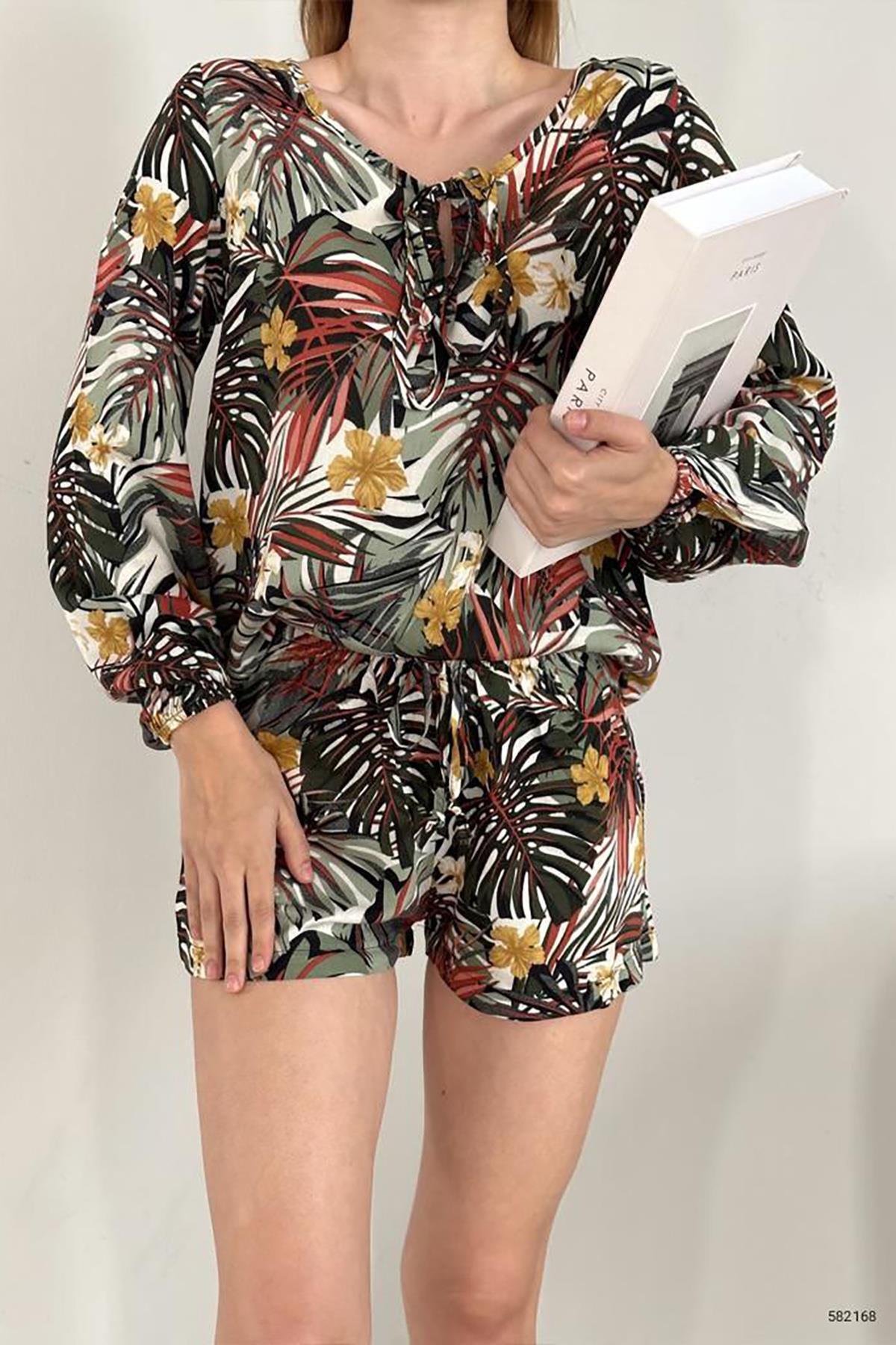deafox Multicolored Leaf Patterned Viscose Fabric Shorts Set