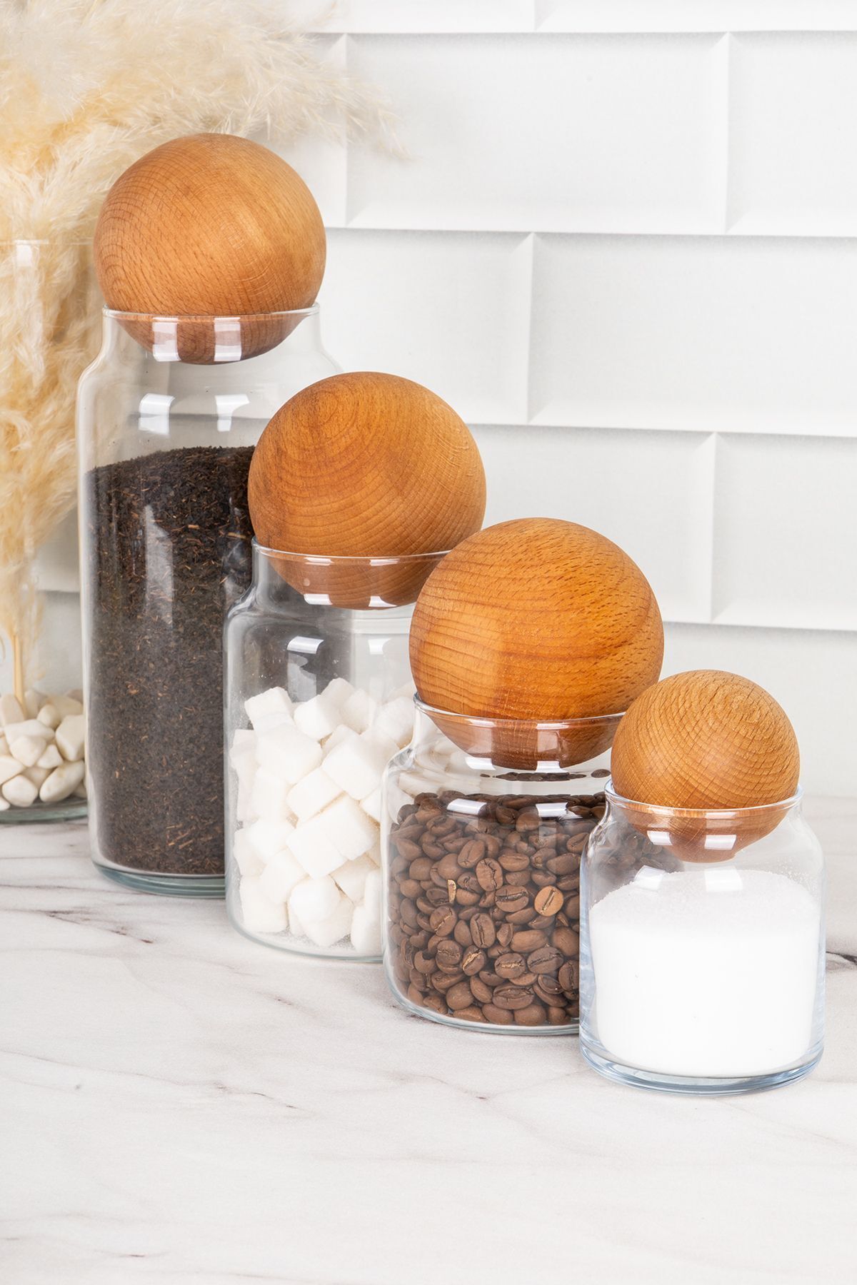 DNS HOME 4-Piece Glass Jar Set with Wooden Ball Lid Storage Container Spice Jar Set 1300 ml-800 ml-500 ml-300 ml