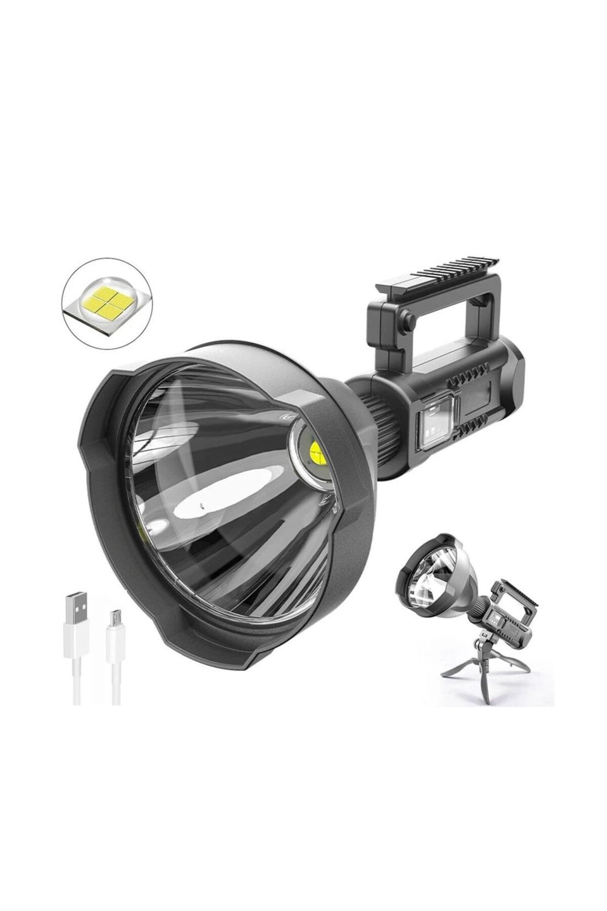 battery autonomy of 10 hours, range of 1000 m, luminous flux of 90000 lm, LED bulb, power supply voltage of 12 V, bulb power of 20 W, and an LED indicator for battery power. Includes tripod and USB cable. The flashlight offers 4 lighting modes: maximum, high, low, and flash, activated by successive button presses on the handle.