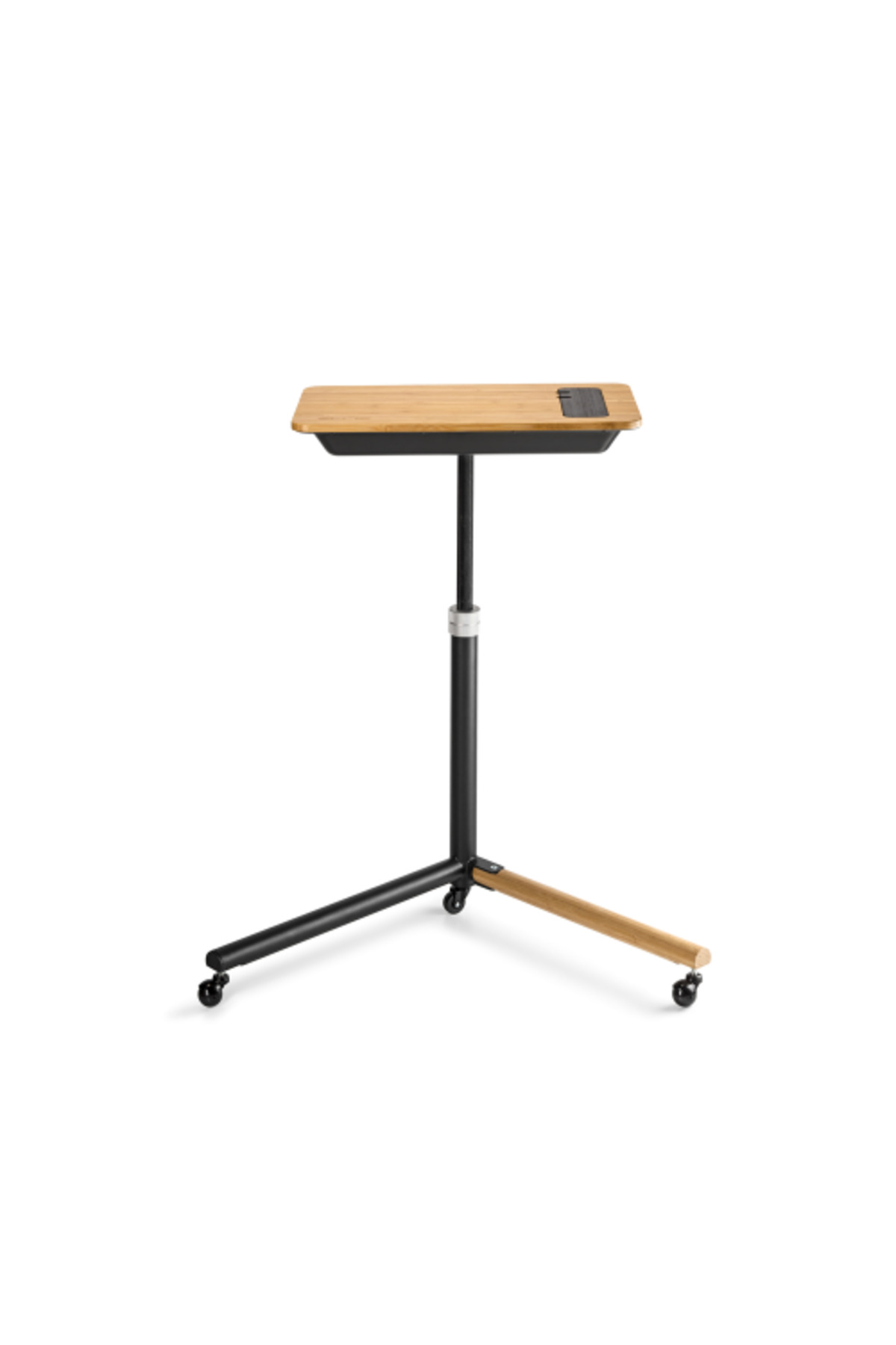 elegant design with hidden cable compartment; strong steel and bamboo construction; adjustable height from 75 cm up to 120 cm; equipped with non-slip rubber mats and a tablet holder; foldable and easy to store