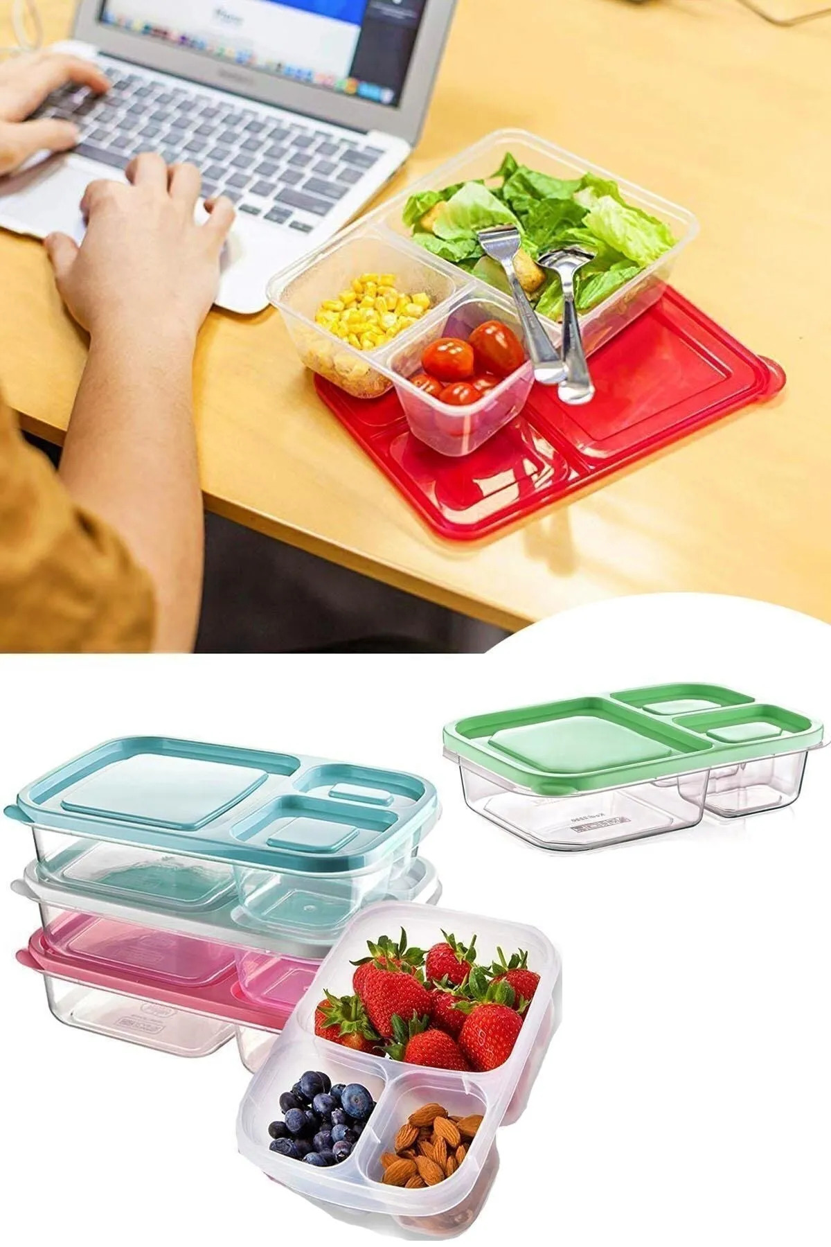 Emofom Smart 1.2 Lt Rectangular Storage Container 3 Compartments Lunch Box Breakfast Container (15.5 X 24 X 5.1 CM)