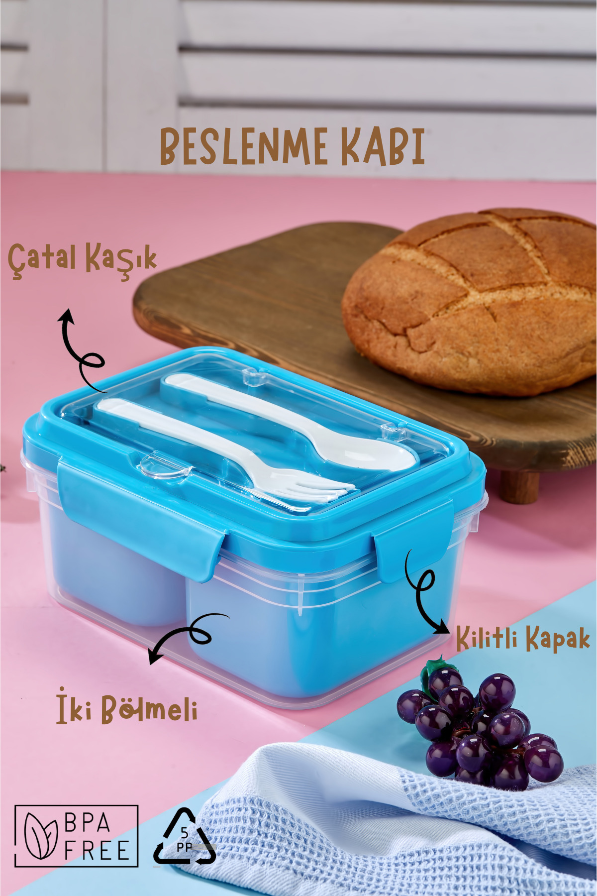 Espas Home Two-Compartment Lunch Box with Fork-Spoon Compartment and Locking Lid and Food Storage Container - Blue