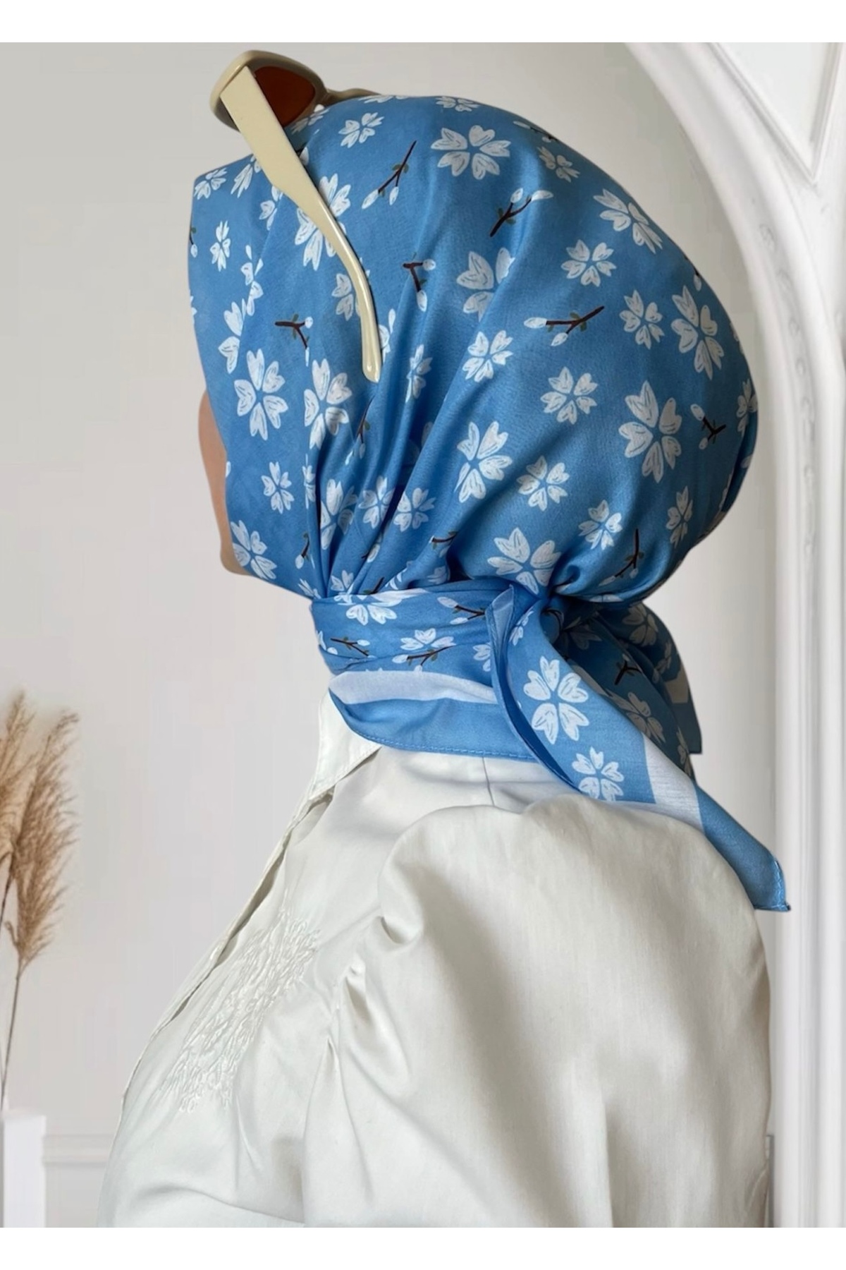 ESSLERA Cherry Blossom Patterned Blue Soft Scarf features