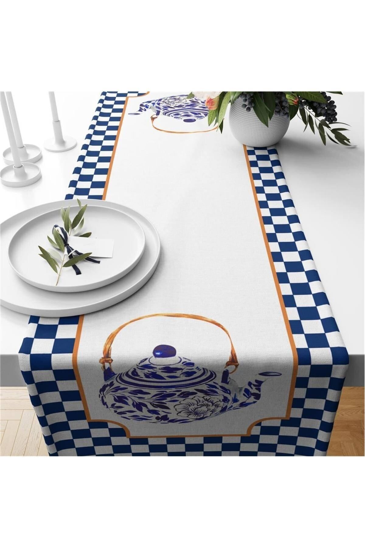 Evmila Blue Gingham Patterned Velvet Runner features