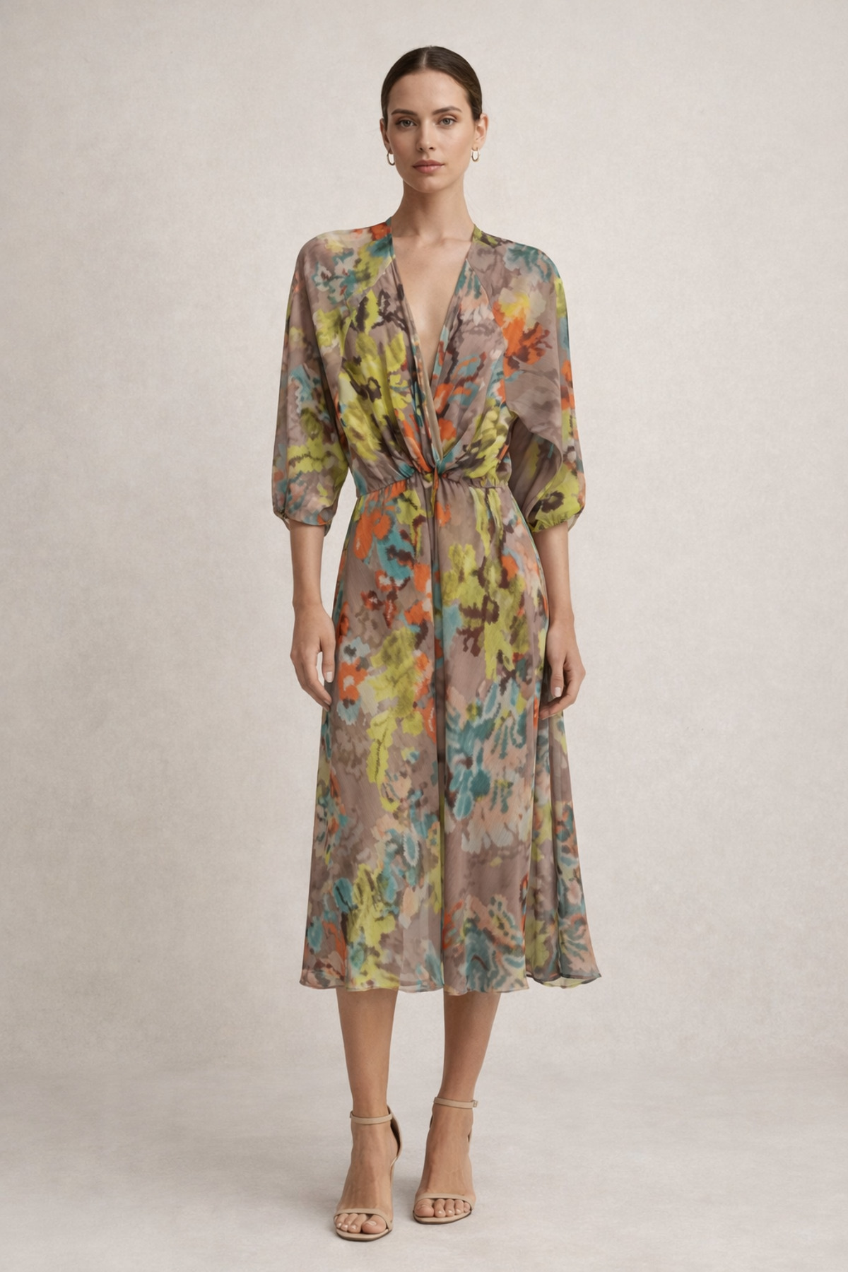 EXPLOSION Patterned Chiffon Midi Dress - Double Breasted Collar features