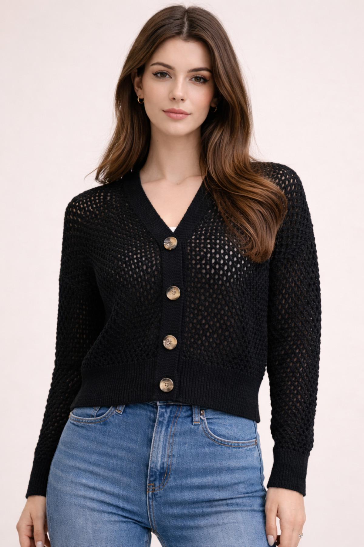 FERHEL Openwork Bone Buttoned Slit Cardigan - Black features