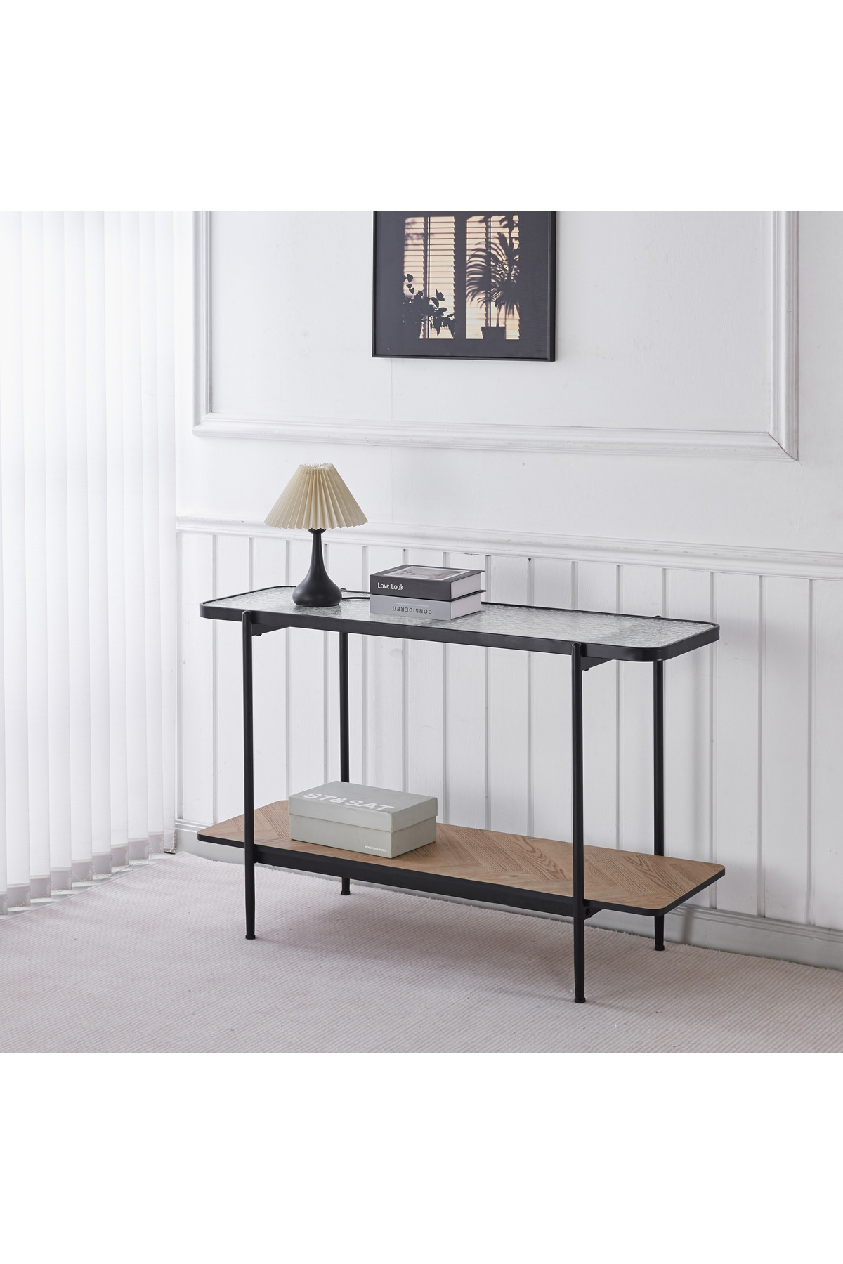 Generic Baldwin Glass Top Console Table with Shelf features