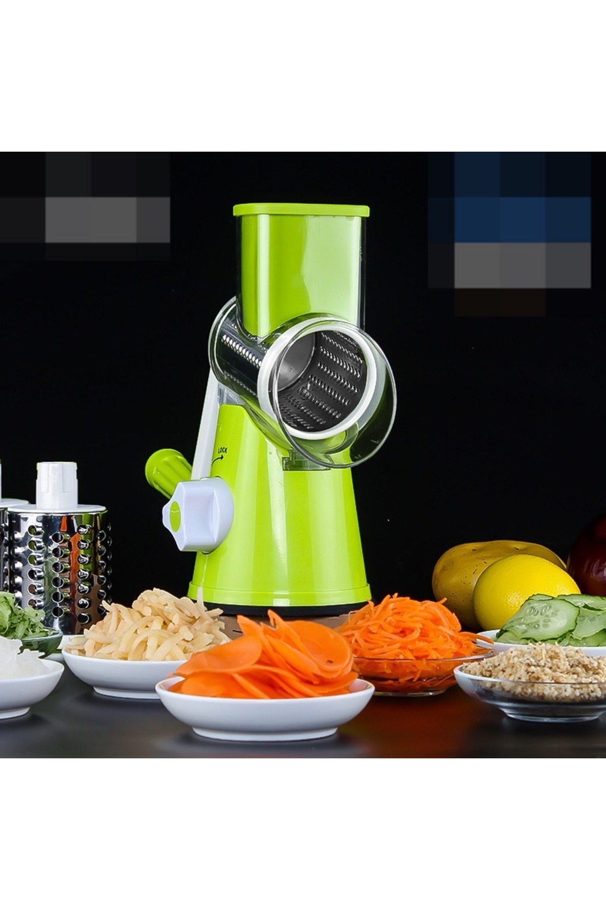 Manual/automatic use: 1. Secure the appliance to a smooth surface using the green suction base. 2. Attach the required blade (fine/coarse/slicing). 3. Place the ingredients in the feed chute. 4. Turn the hand crank to quickly finish the preparation process.