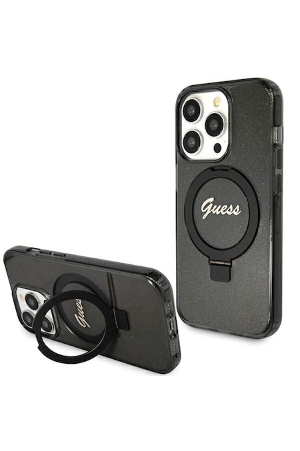 Guess Case for iPhone 15 Pro Max - Black (Ring Stand, Script Logo, Glitter) features