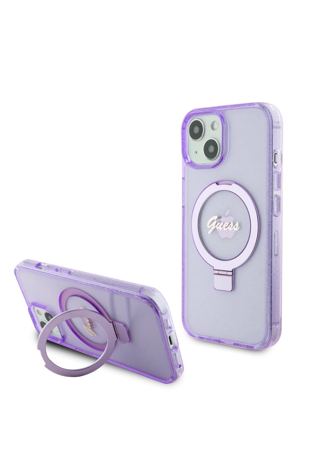 Guess Case for IPhone 15, Ring Stand Script Glitter - Purple features