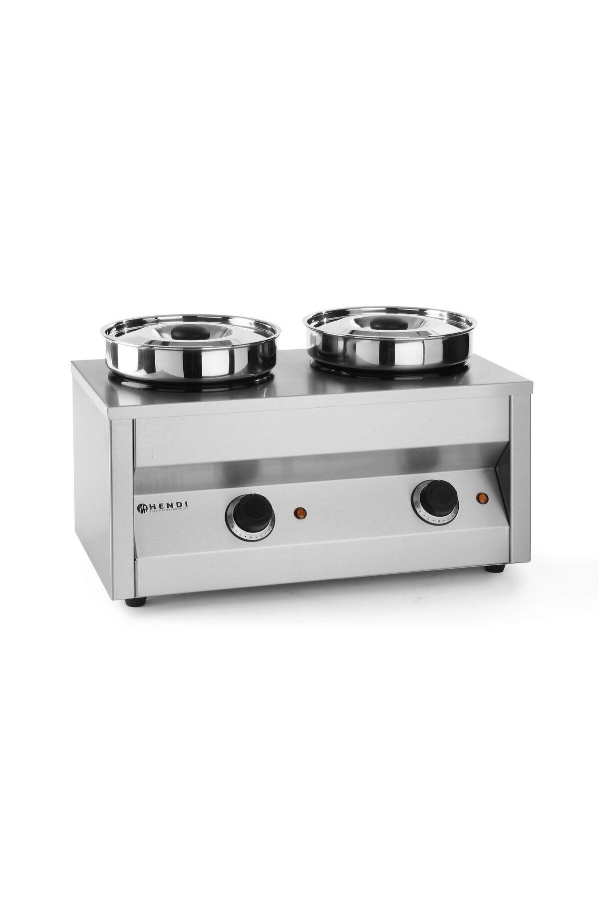 Temperature can be set up to 85°C. Anti-slip feet ensure stability during operation. Features enameled water reservoirs (ø185 mm), stainless steel soup containers with lids (ø200 mm), and two temperature regulators (8°-85°C).