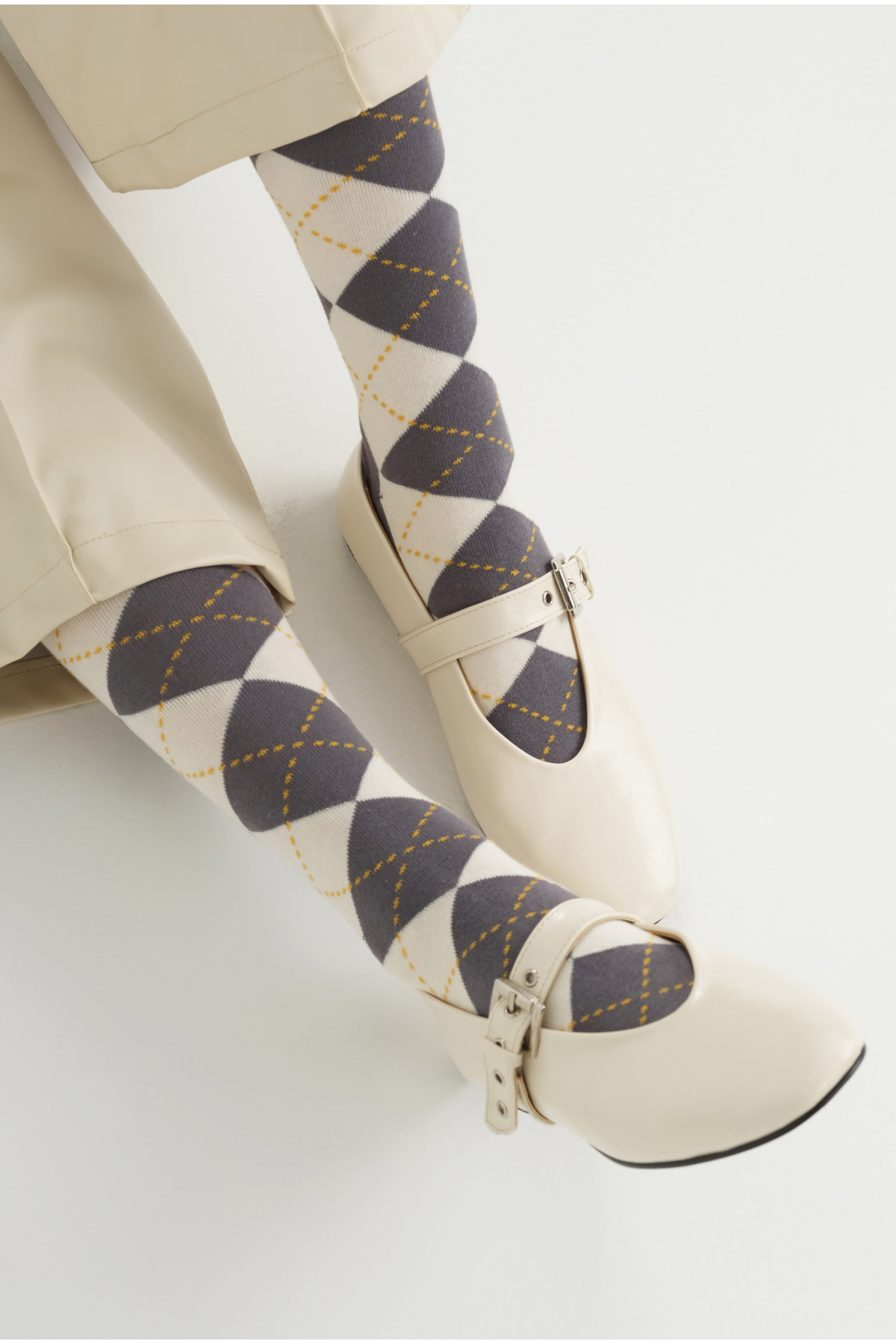 HEQA Baklava Pattern Knee Socks Grey-Ecru