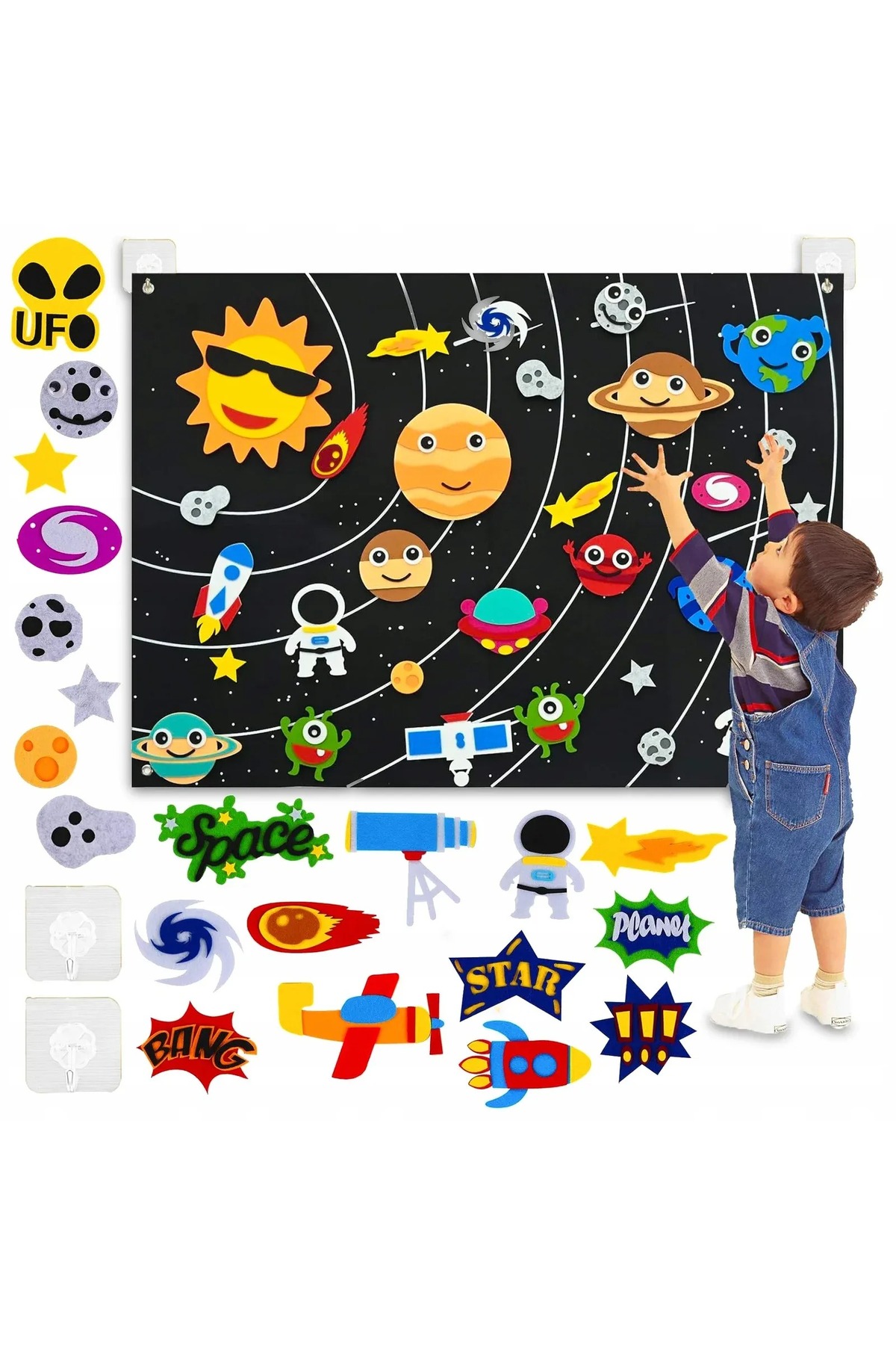 Hurt Educational mat, solar system pattern, 31 removable elements, felt, 103x75 cm features
