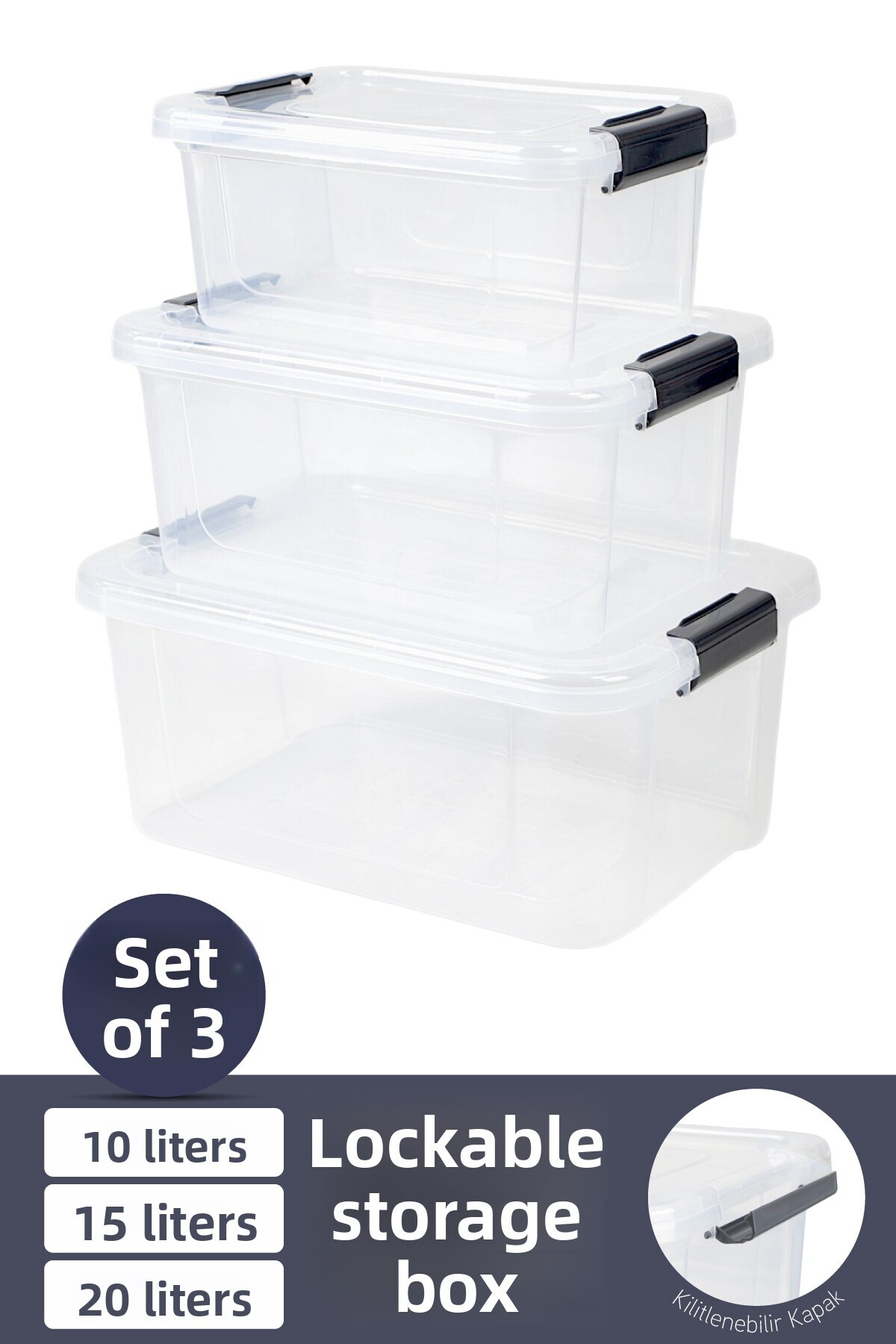 İronika 3-Piece Storage Container Horizontal Rectangular with Locking Lid Multi-Purpose Toy Storage Box 10-15-20 Liters