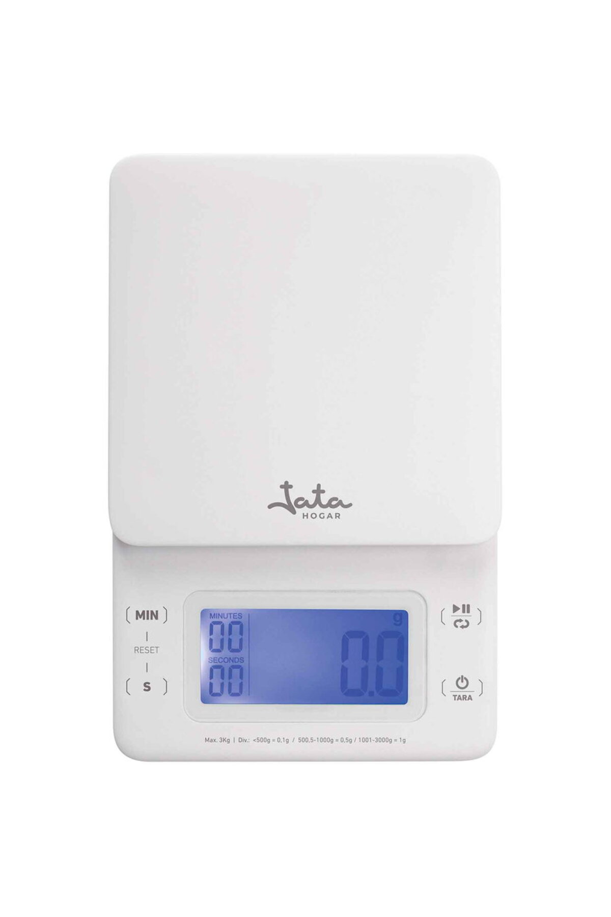 Capacity 3 kg, Graduation 0.1 g, High weighing accuracy, Charge indicator light, Rear magnet to place on the fridge, Backlight LCD display, Acoustic ON touch button, Low battery indicator, Overload indicator, Net weight function, Timer up to 99 min and 60 seconds, G/oz/oml - conversion function, Automatic switch off, USB cord included