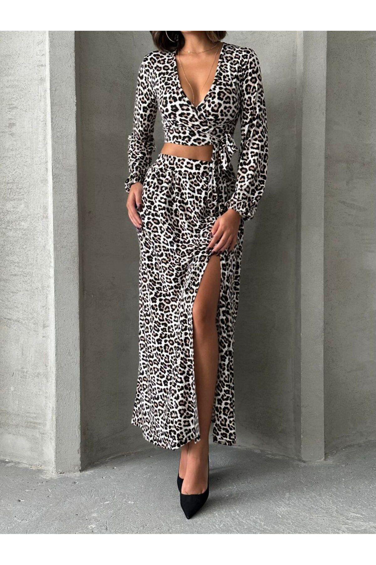 Jeevee Leopard Pattern Blouse Skirt Set features