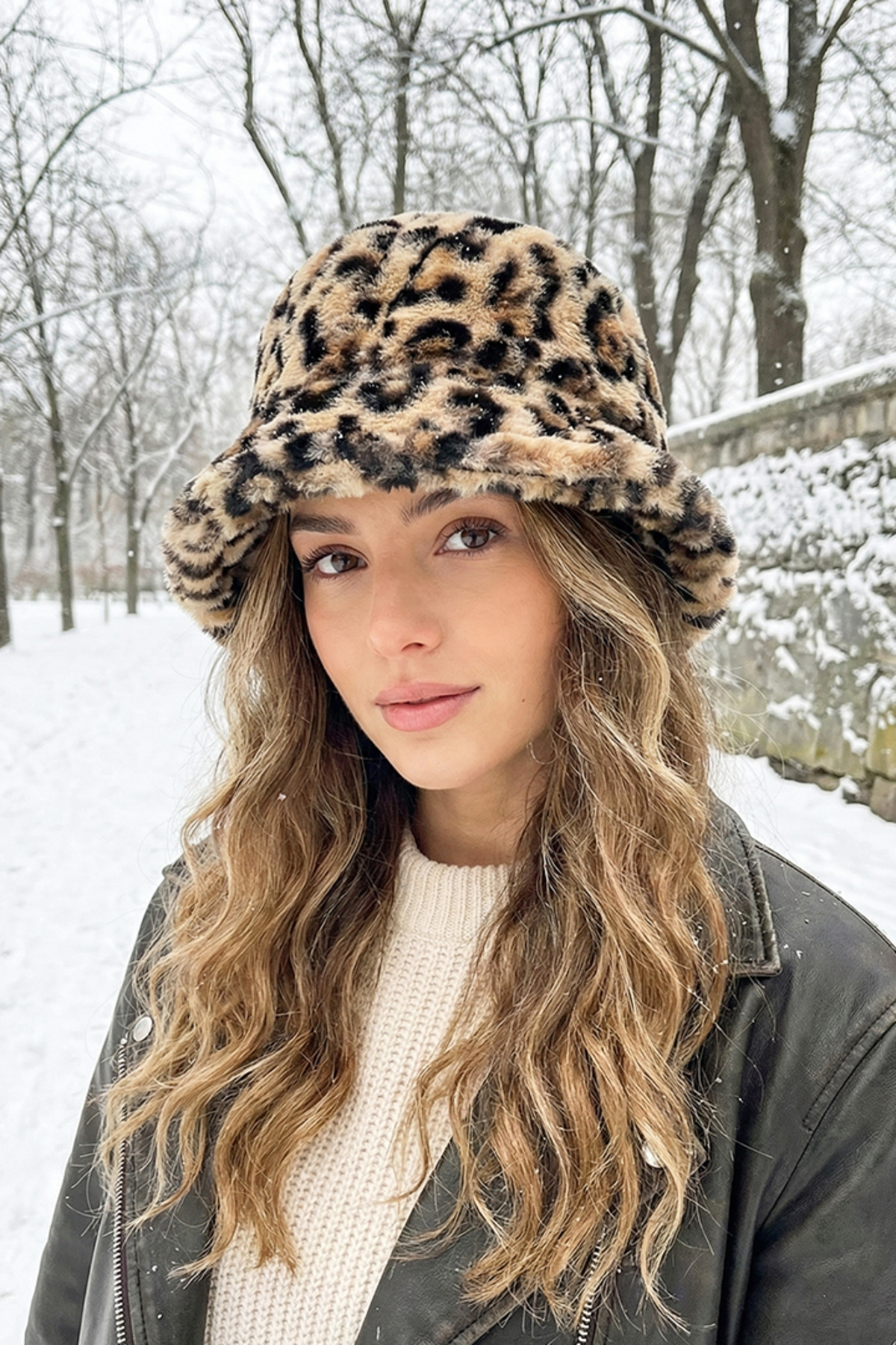 Kapin Leopard Plush Bucket Hat features