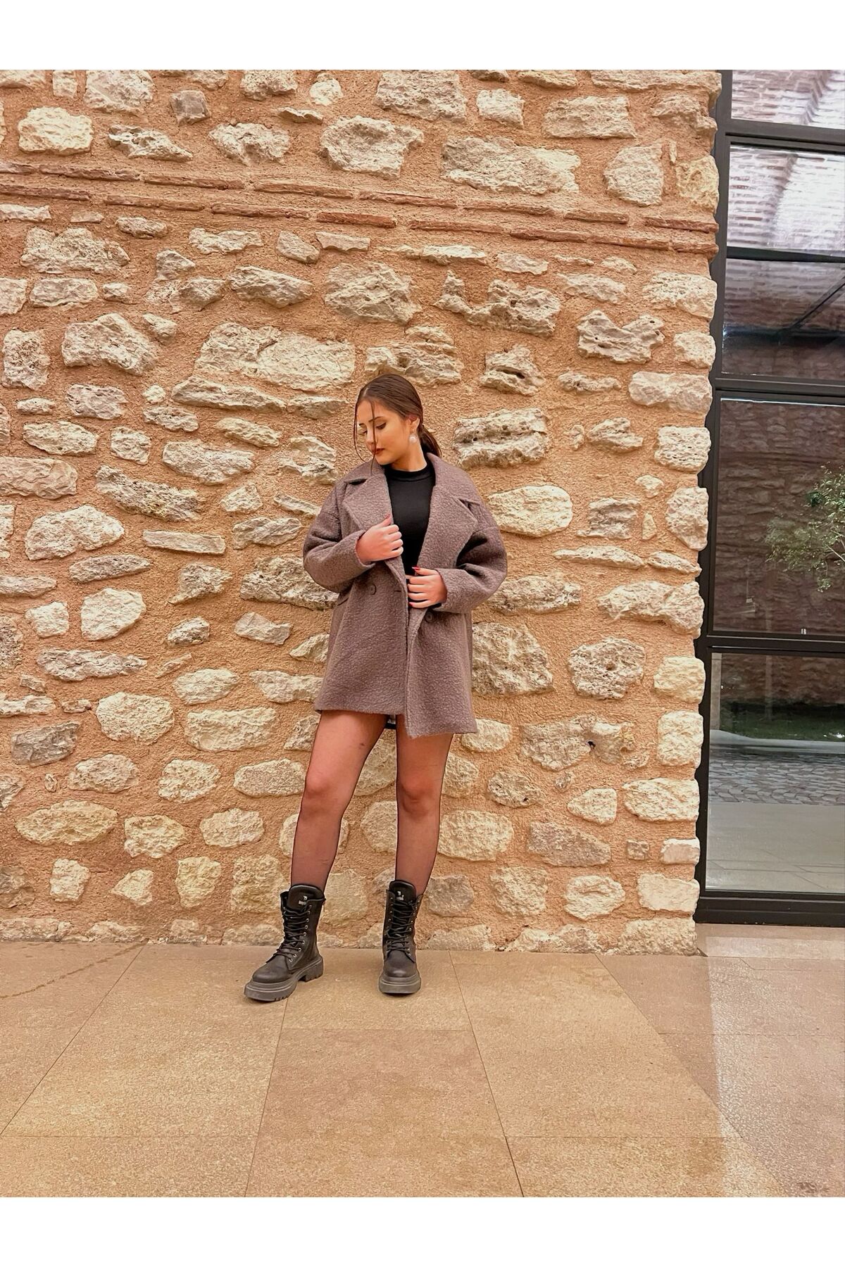 Kir Oversize Single Button Plush Patterned Short Coat features