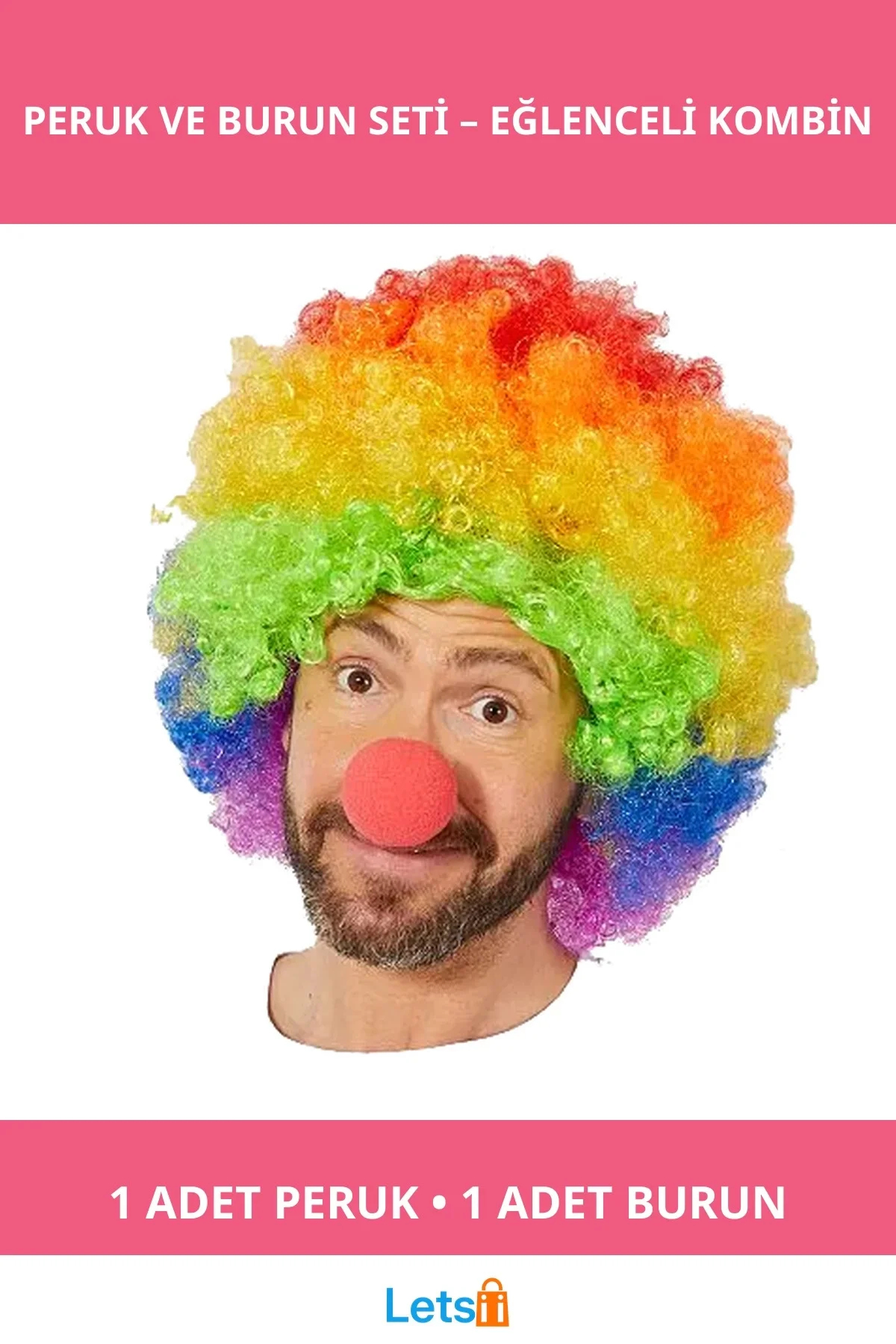 Letsii Rainbow Patterned Afro Wig and Red Sponge Nose Set