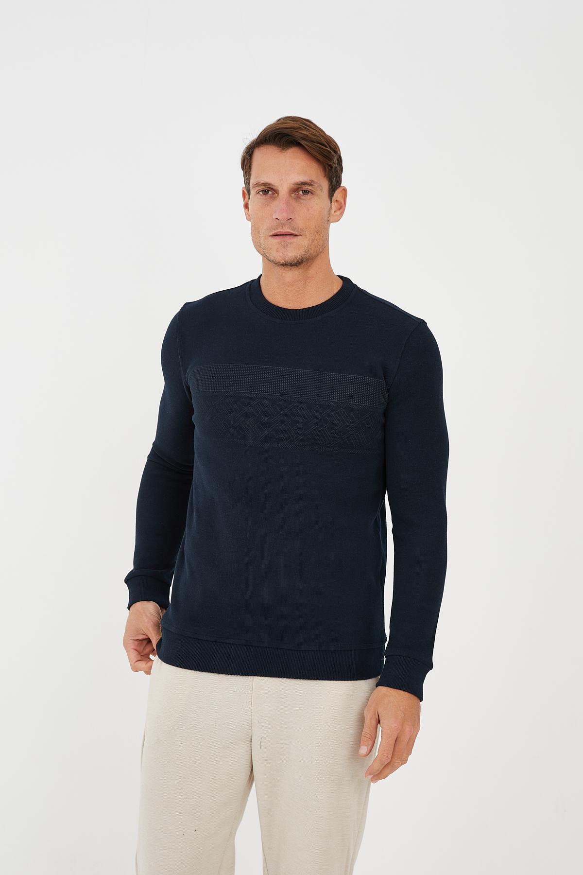 Maccali Men's Crew Neck Patterned Long Basic Sweatshirt Navy
