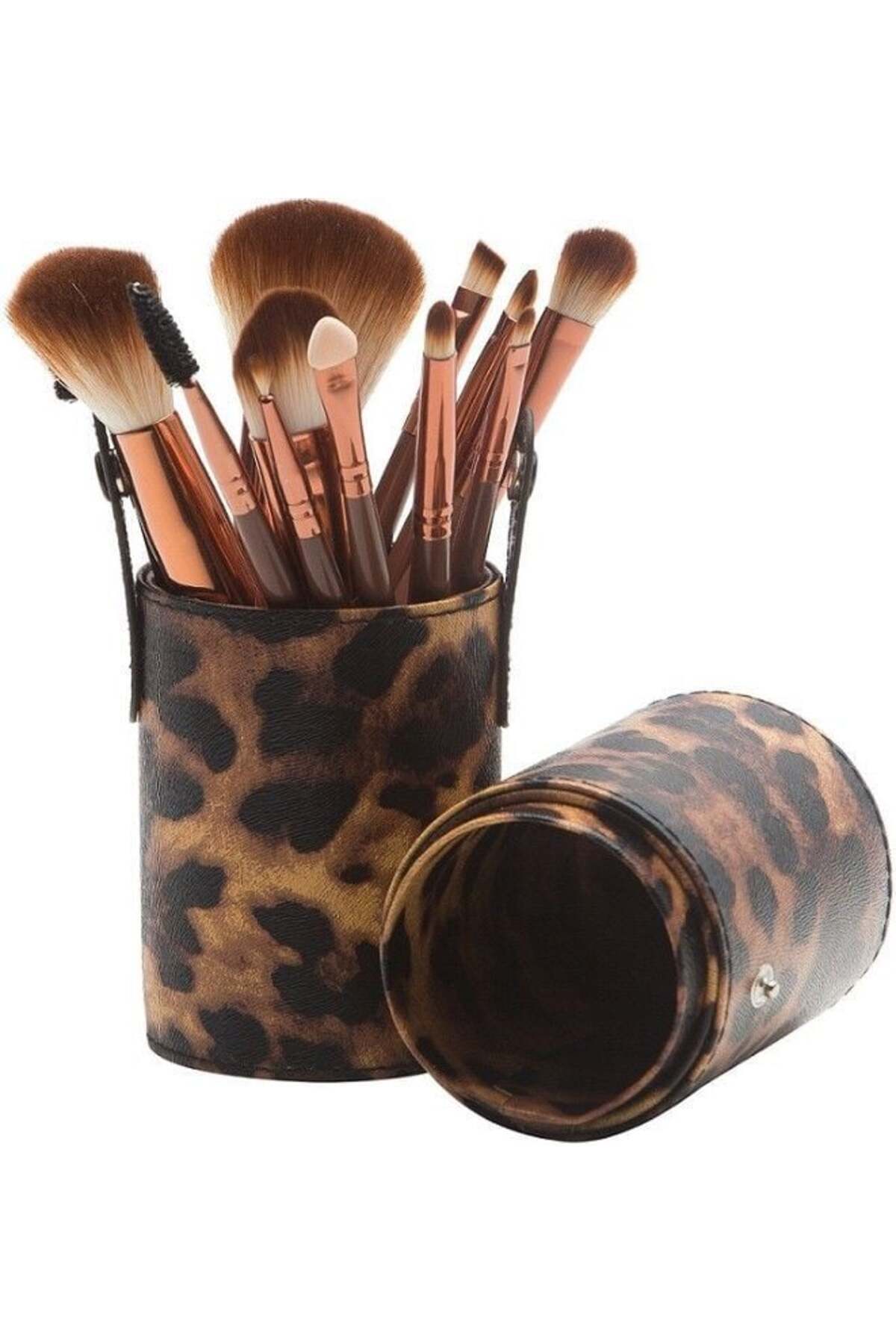 Makeup Set of 12 Makeup Brushes, Leopard Storage Case