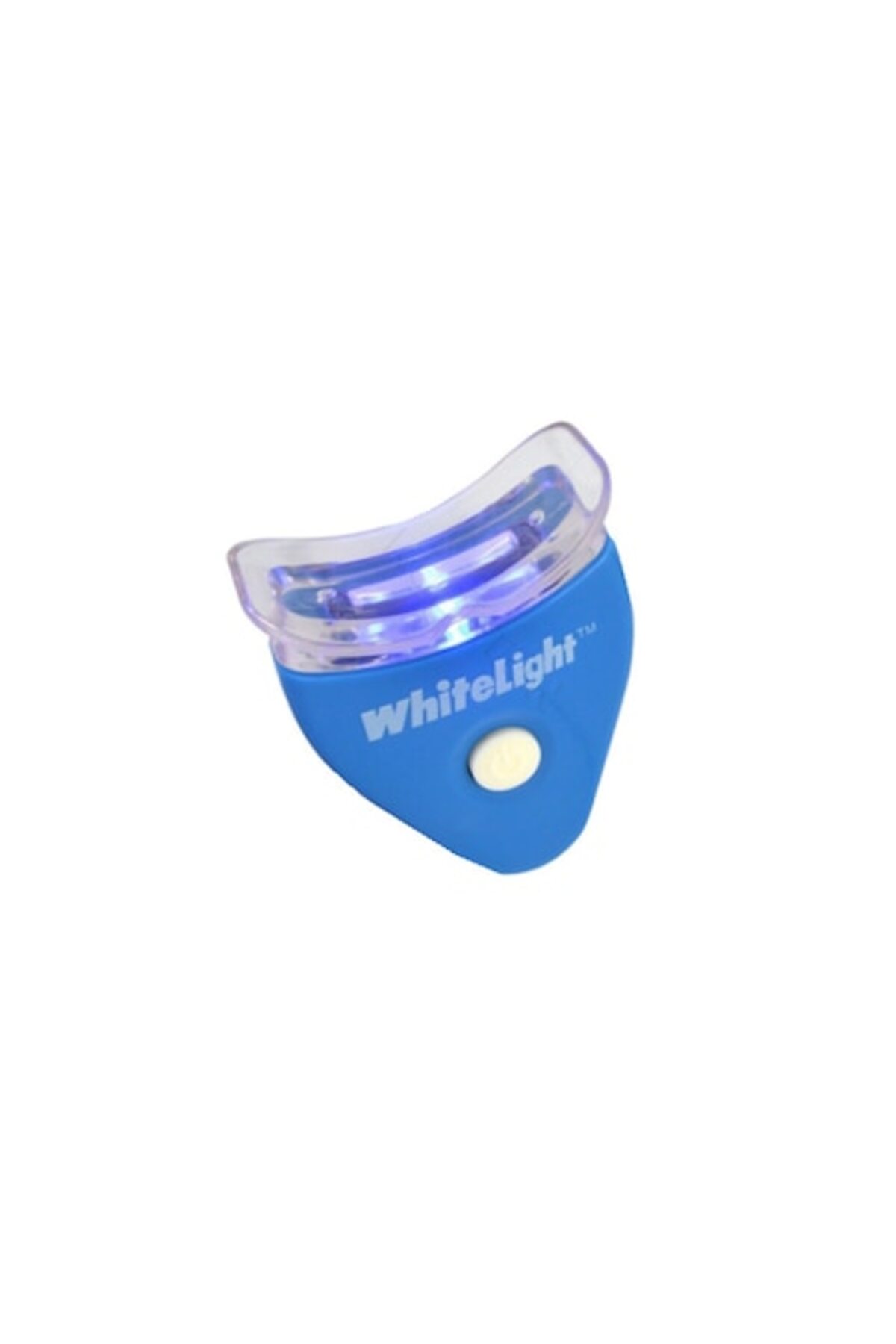 light transmitter, whitening gel tube for complete treatment, dental mask for uniform application, and 2 CR 2025 batteries