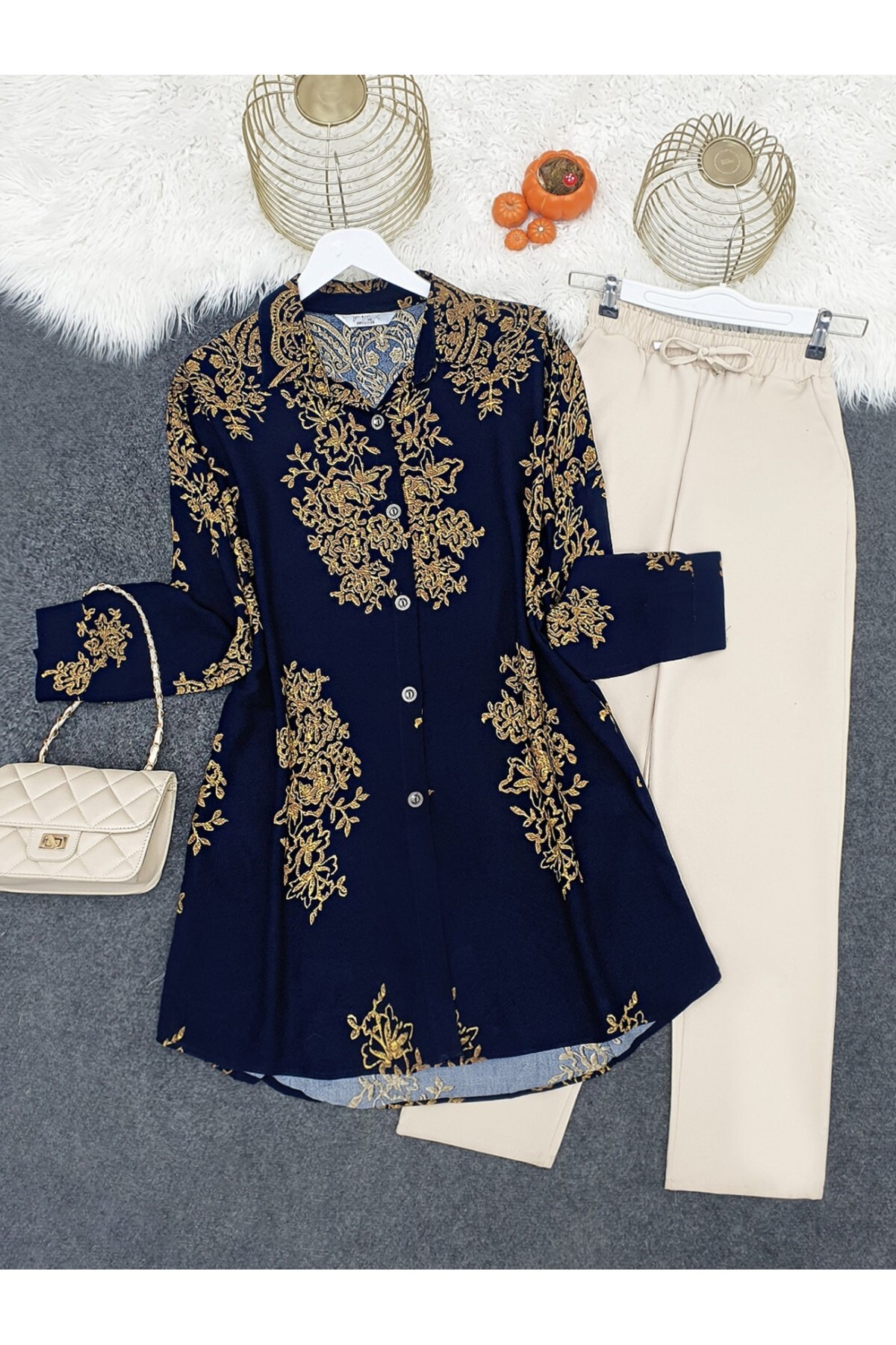 Modamorfo Patterned Buttoned Long Back Viscose Tunic - Navy
