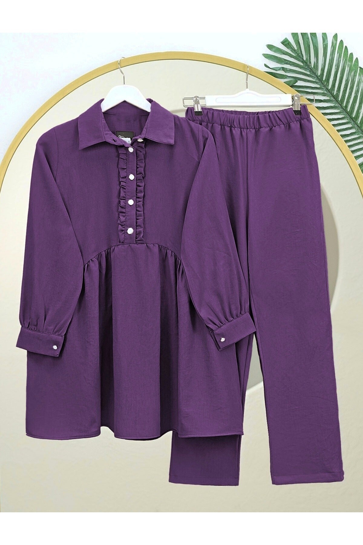 Modamorfo Ruffled Front Half Button Linen Suit - Plum features