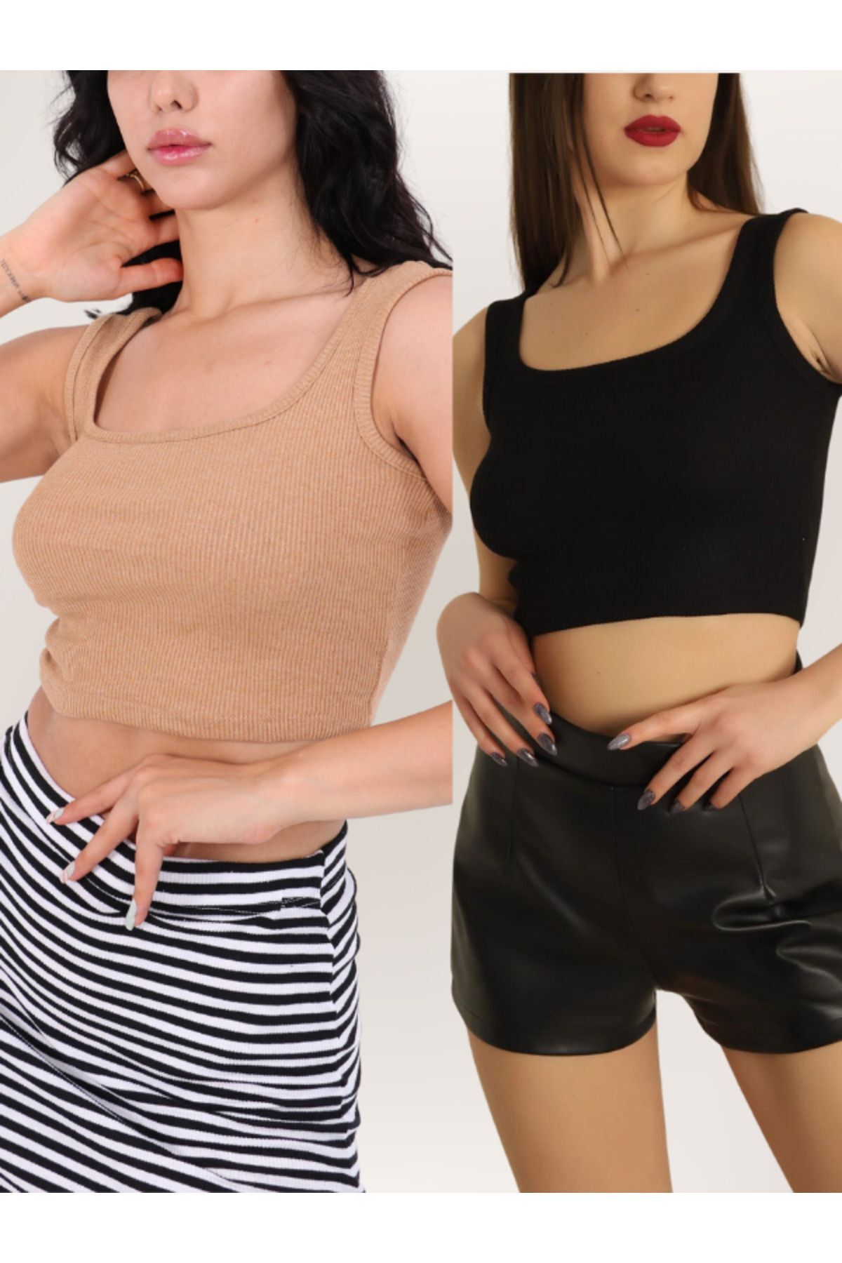 Modark Square Collar Corded Crop Tank Top - Zero Sleeve, Lycra Set of 2 Black-Beige