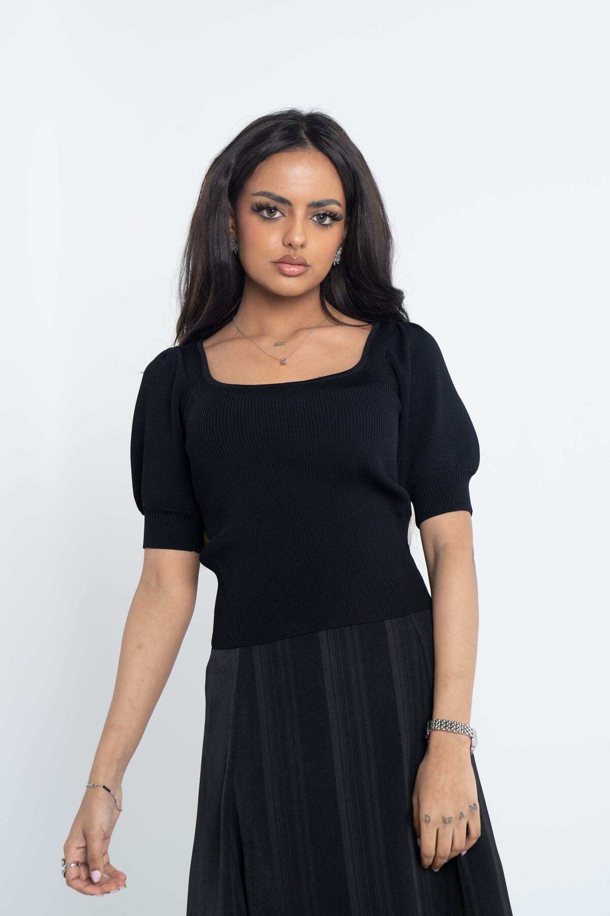 Nichii Solid Short Sleeve Blouse with Square Neck