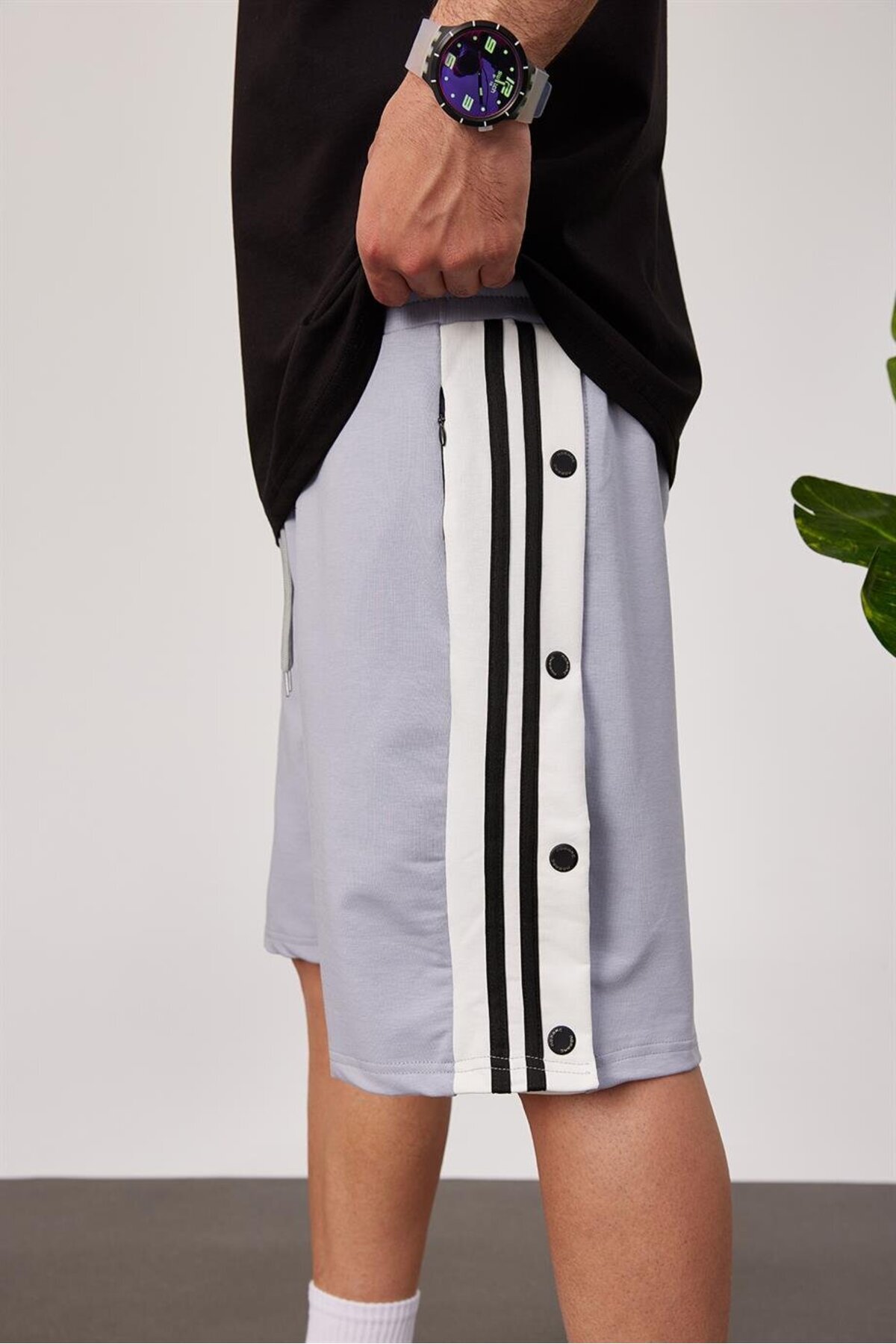 NOMARC 2-Stripe Buttoned Gray Shorts features